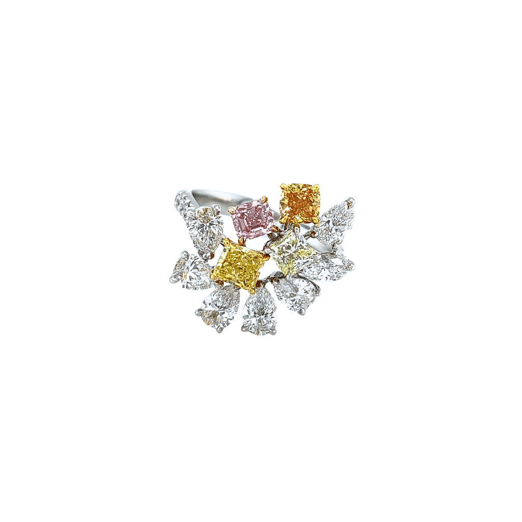 Made with platinum and rose gold colored diamonds cluster ring. 4 colored diamonds totaling 1.21 carat weight. Diamonds totaling 2.01 carats.