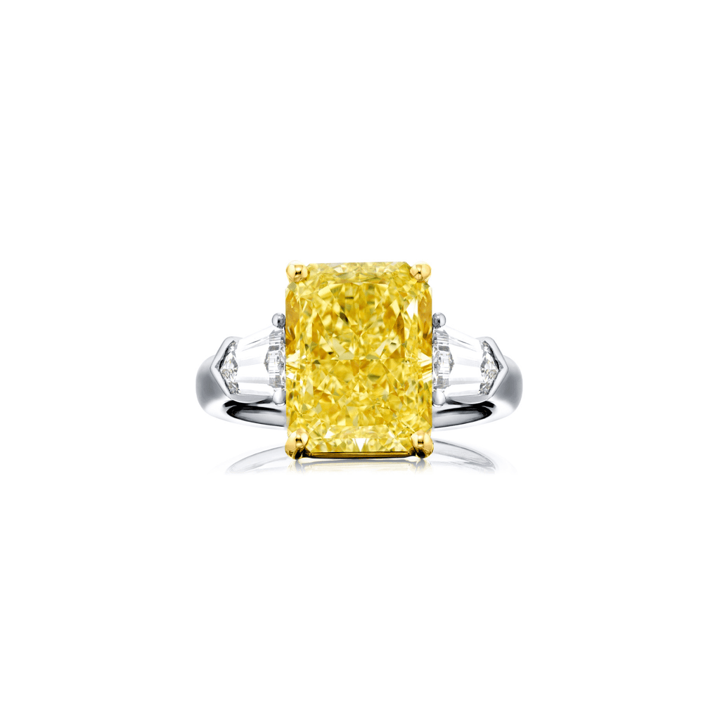 Made with platinum and 18 karat yellow gold yellow diamond ring. Diamonds totaling 1.17 carat weight. Radiant-cut fancy yellow diamond 7.03 carats, VS2 clarity.