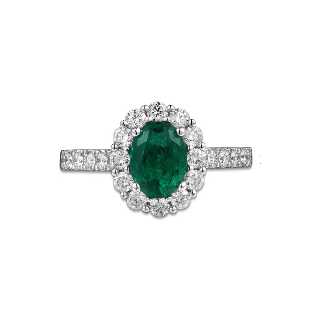 Made with 18 karat white gold emerald diamond ring. Emerald 1.09 carat weight. Diamonds totaling 0.77 carat weight.