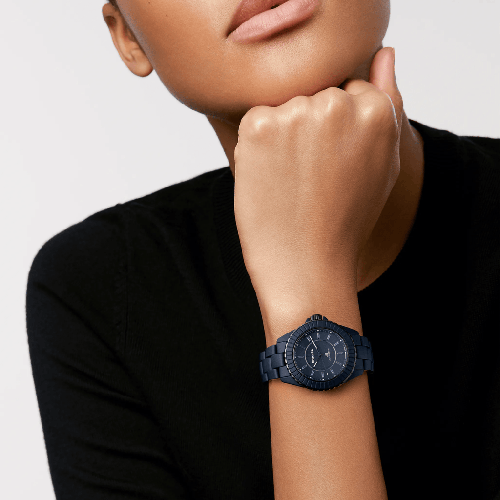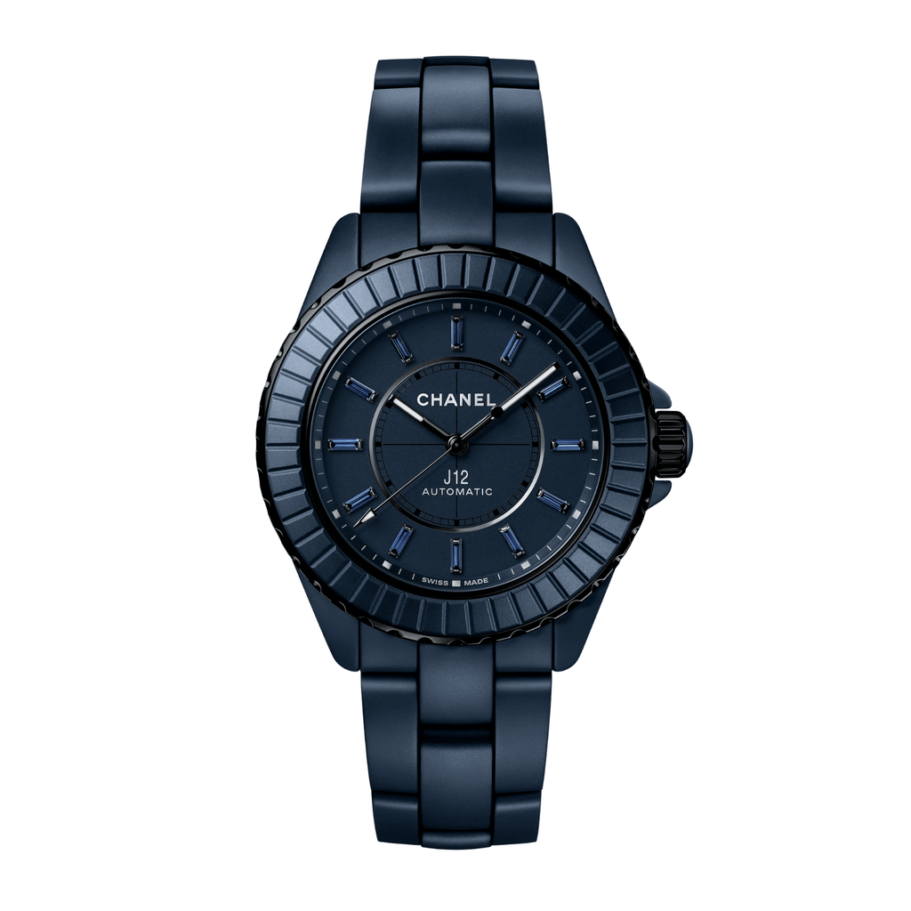 Introducing the CHANEL J12 Bleu Watch, featuring a 38mm matte blue ceramic and black-coated steel case with a baguette-cut pattern bezel and crown. The dial is adorned with 12 blue sapphires, while the triple-folding buckle secures the matte blue ceramic bracelet. With a self-winding mechanical movement and water-resistance up to 200m, this watch offers both style and functionality.