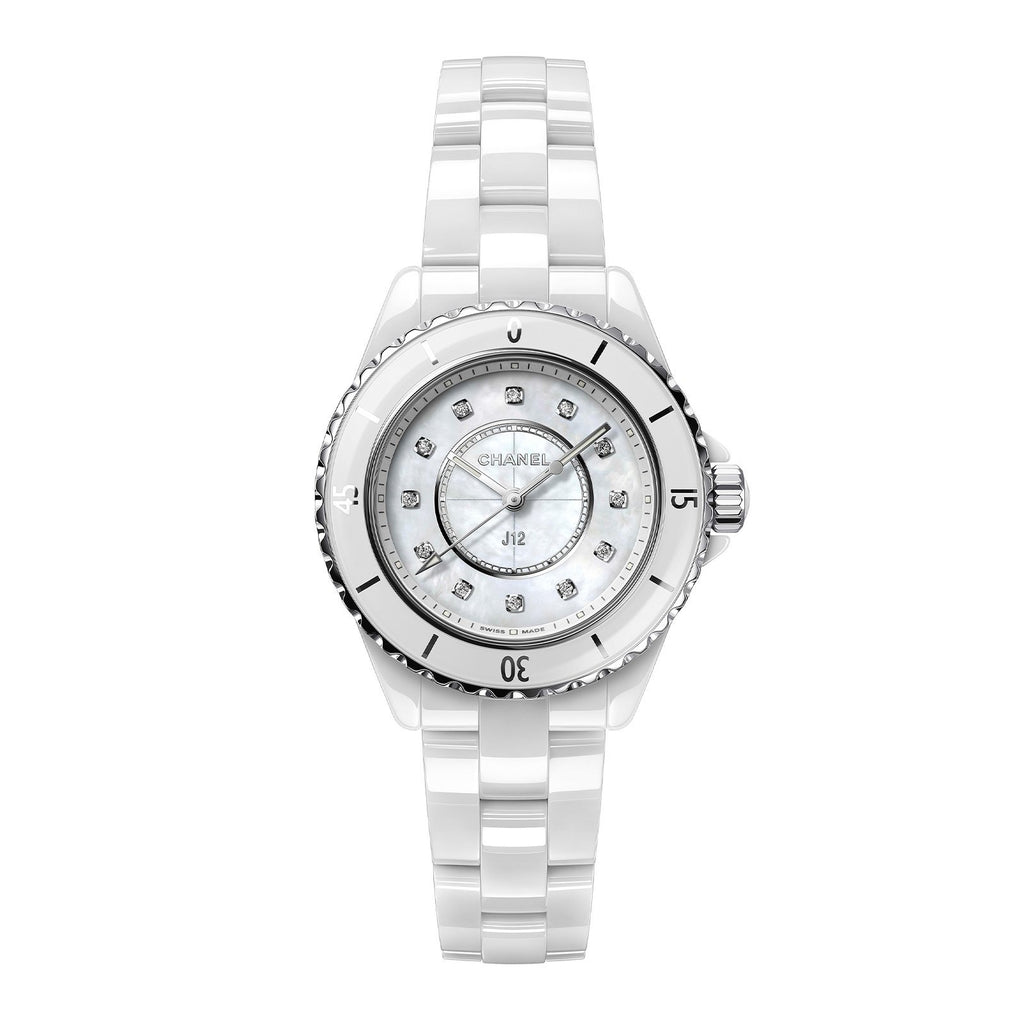 White highly resistant ceramic and steel, diamond indicators, white mother-of-pearl dial