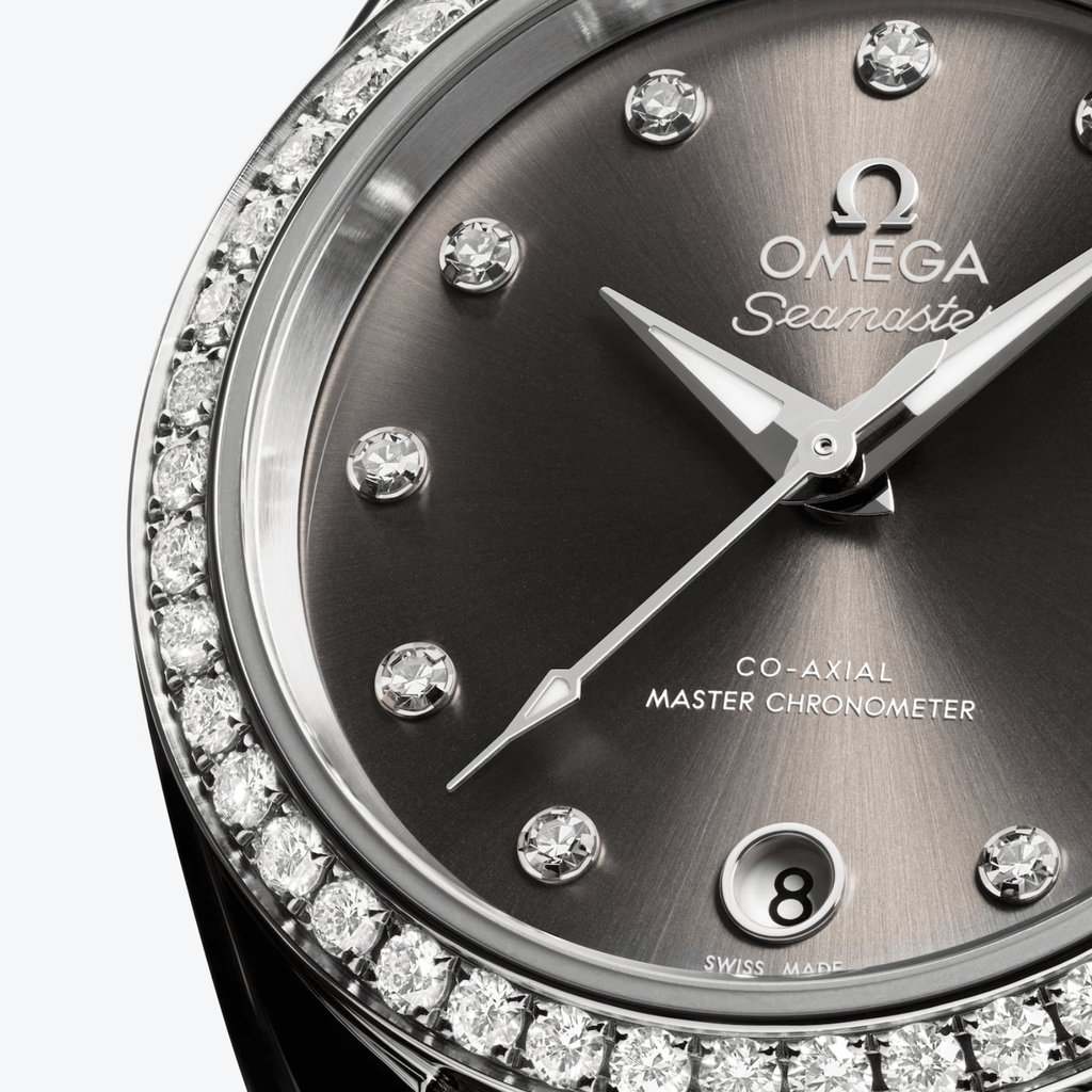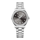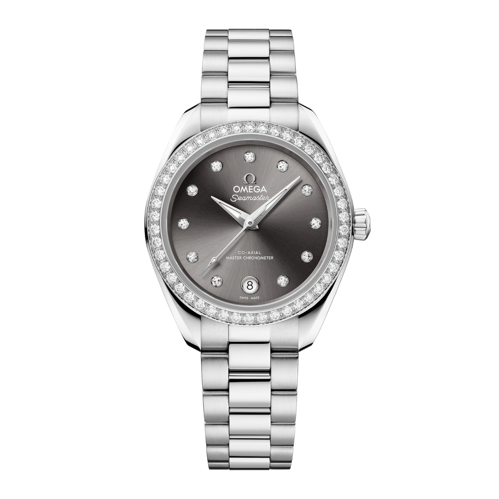 This Omega Seamaster Aqua Terra features a 30mm stainless steel case with diamond bezel paired with a grey dial with diamond markers. It offers water resistance up to 15 bar and is powered by an automatic movement with a 48-hour power reserve. The watch includes a date function and is secured by a stainless steel bracelet.