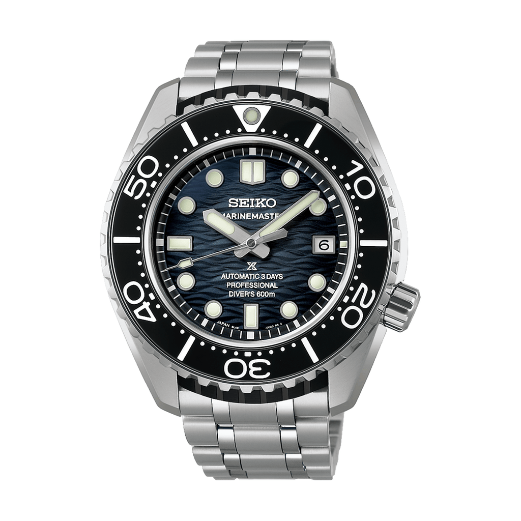 Seiko Prospex Marinemaster in a 45.4mm stainless steel case with blue dial on stainless steel bracelet, featuring a date display and an automatic movement with up to 72 hours of power reserve.  Seiko Diver’s Watch 60th Anniversary Limited Edition. Limited edition of 600 pieces.