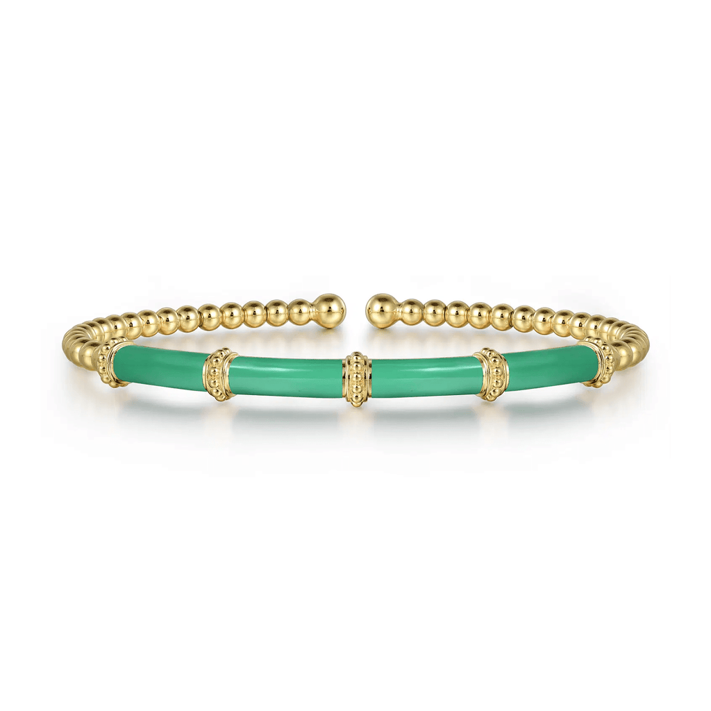 Gabriel & Co. Bujukan Beads Split Bangle in 14 karat Yellow Gold with Green Enamel.