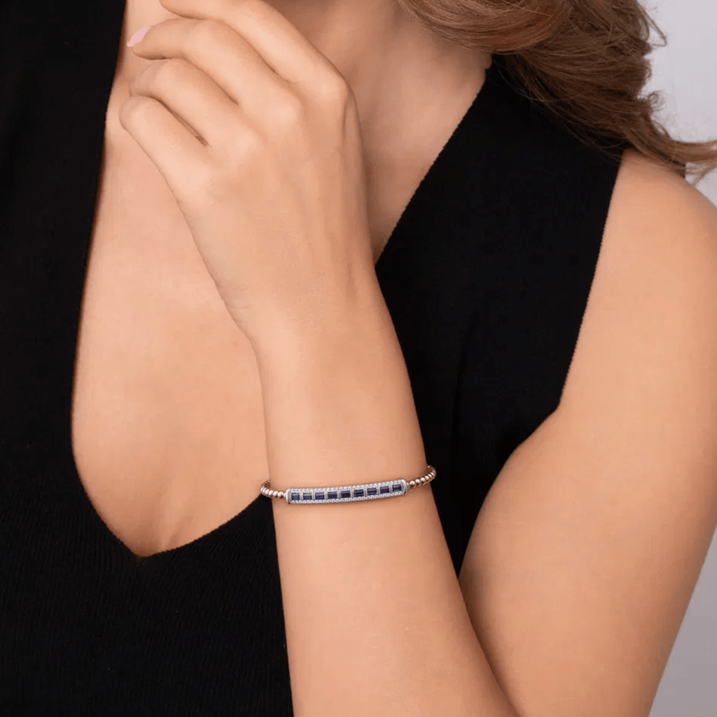 Elevate your collection with the Gabriel & Co. Bujukan Diamond and Baguette Blue Sapphire Bar Split Bangle Bracelet. Featuring 0.4 carats of meticulously set diamonds paired with striking baguette-cut blue sapphires, this bracelet offers a refined balance of brilliance and color.