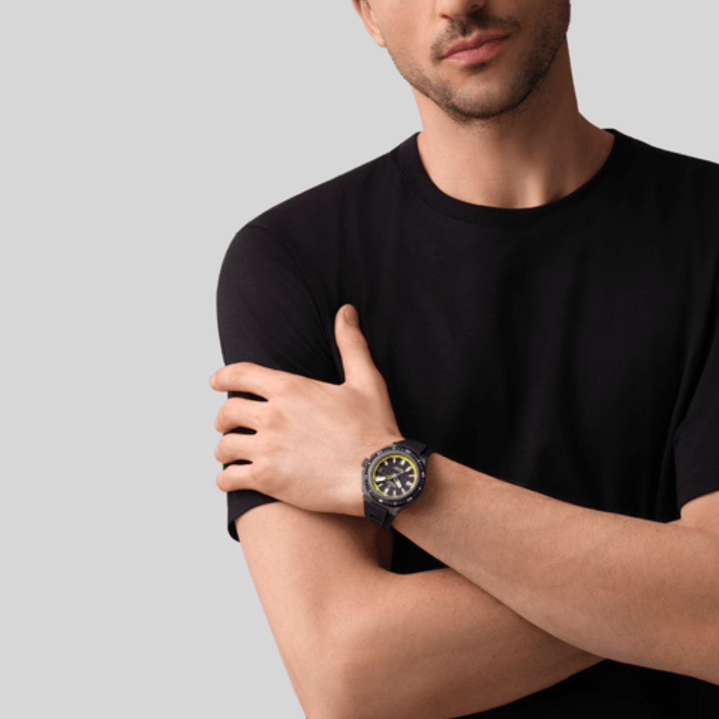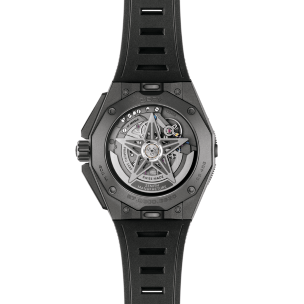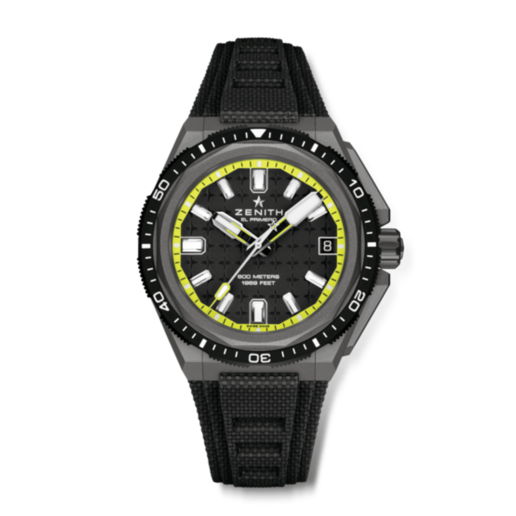 The DEFY Extreme Diver comes in a 42.5mm angular case crafted in microblasted titanium. Equipped with a black ceramic rotating bezel and helium escape valve, with a water-resistance of 60 ATM (600 metres). Featuring a black and yellow star-patterned dial with luminescent markers and hands. Powered by the El Primero 3620 automatic movement with 60 hours power reserve. Delivered with a microblasted titanium bracelet, a black “cordura effect” rubber strap and a black and yellow single-piece fabric strap that can easily be swapped thanks to our clever strap changing system.