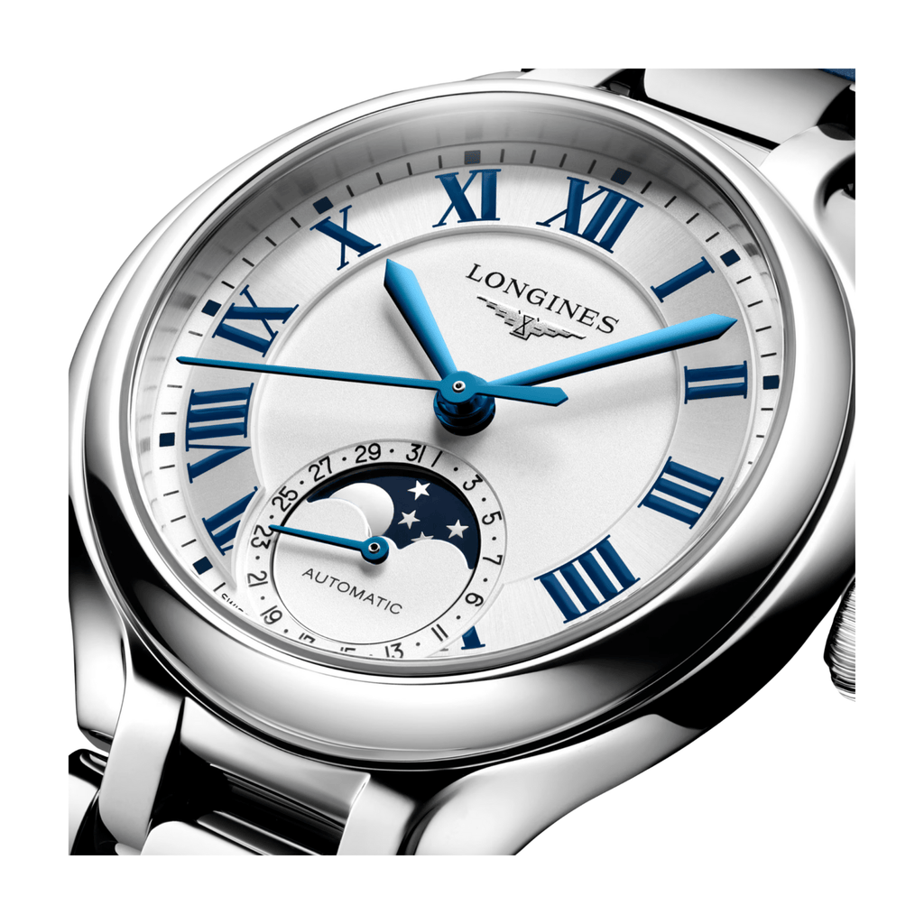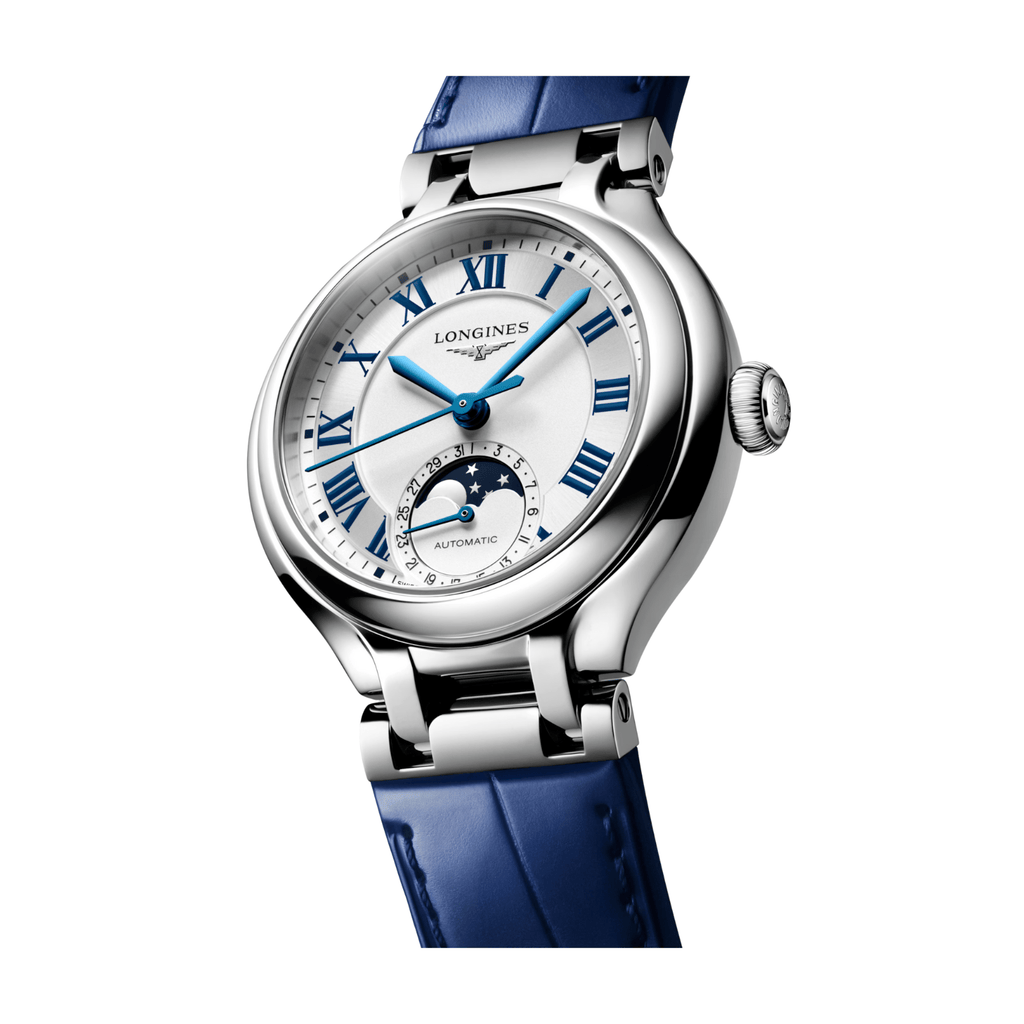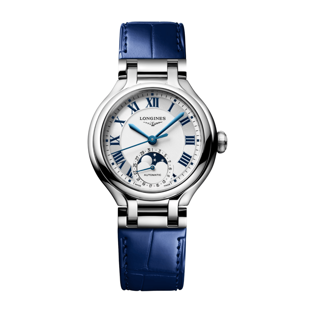 Longines PrimaLuna Moonphase in a stainless steel 34mm case with silver dial on blue alligator strap, featuring a moon phase, date, and automatic movement with up to 72 hours of power reserve. Water resistance of 3 bar.