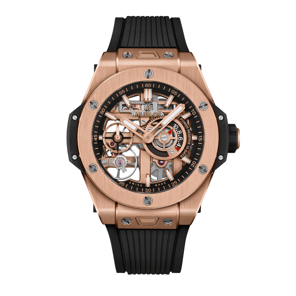The 42 mm case is crafted from Satin-finished and Polished 18K King Gold, with a matching bezel and a water resistance of 100m or 10 ATM. The dial is made of Sapphire with Anti-reflective Treatment and boasts a striking Matte Black Skeleton design. Inside, the watch features the precise and reliable HUB1205 Manufacture Manual-winding Skeleton Power Reserve Movement, providing a power reserve of 10 Days. This product features a black structured lined rubber strap with an 18K King Gold and black-plated titanium deployant buckle clasp.