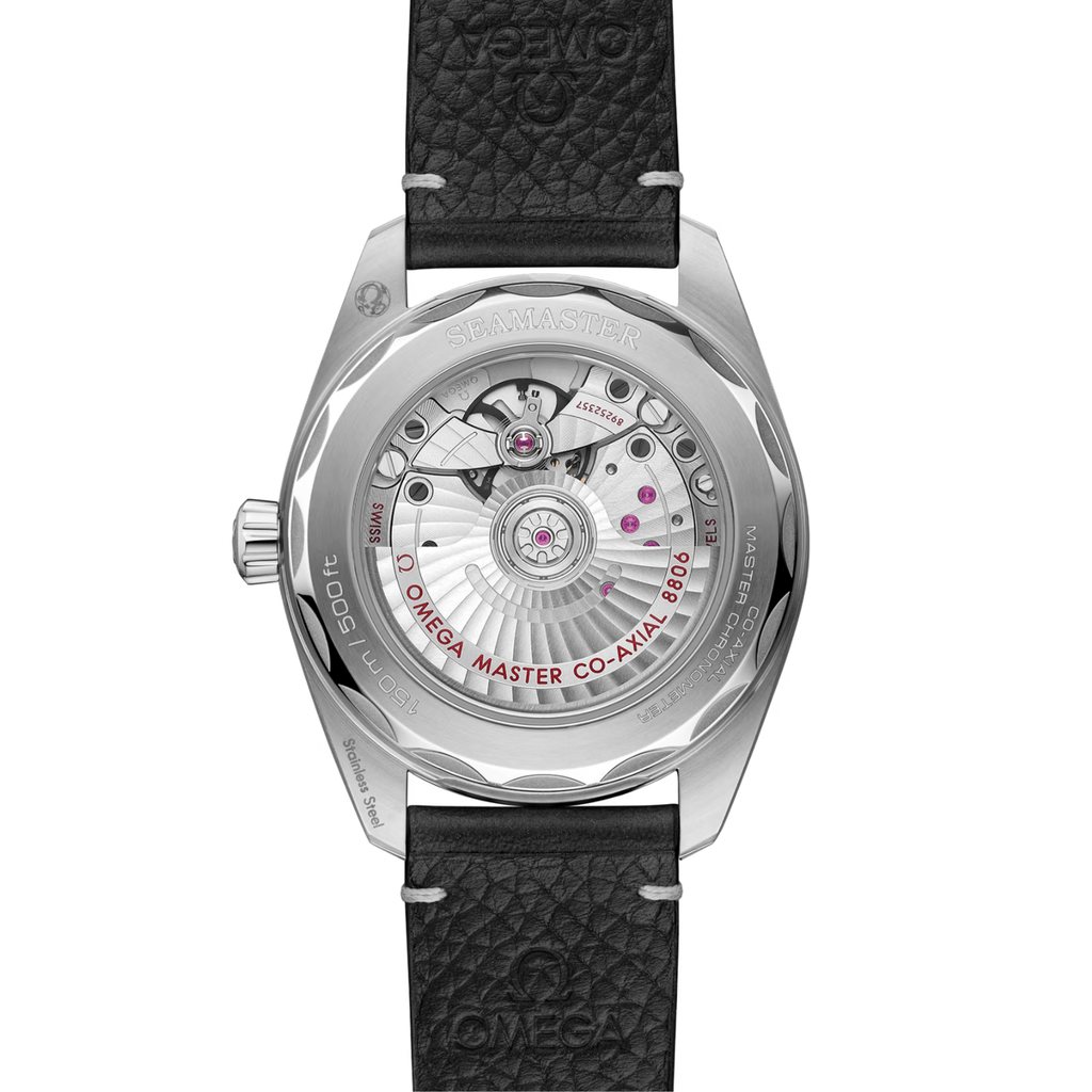 The Omega Seamaster Railmaster 38mm boasts a symmetrical brushed and polished 38mm case and a sleek black leather strap. Its grey dial with a black gradient and white Super-LumiNova numerals and hour markers provides an easy-to-read display, staying true to the original Railmaster's design. This watch features the Co-Axial Master Chronometer Calibre 8806, ensuring anti-magnetism up to 15,000 gauss, and its movement can be seen through the transparent sapphire crystal on the caseback.