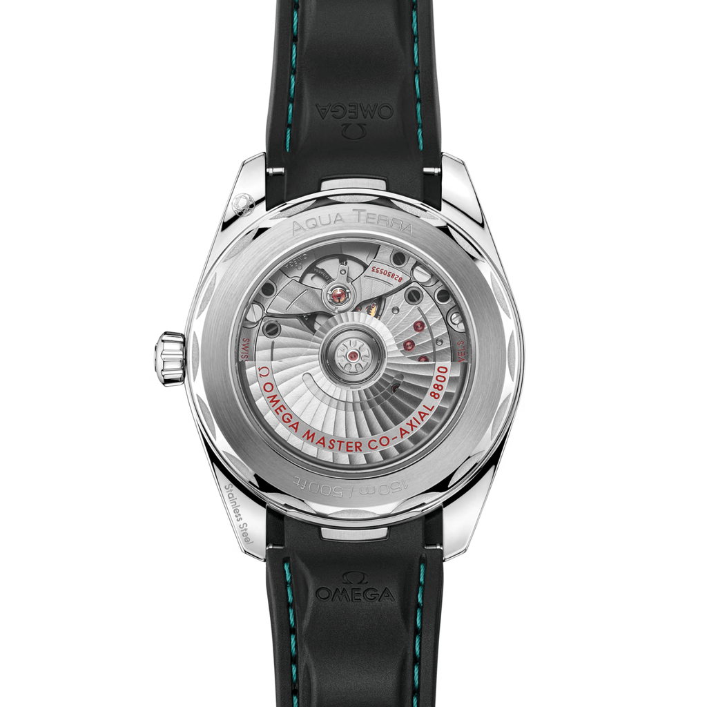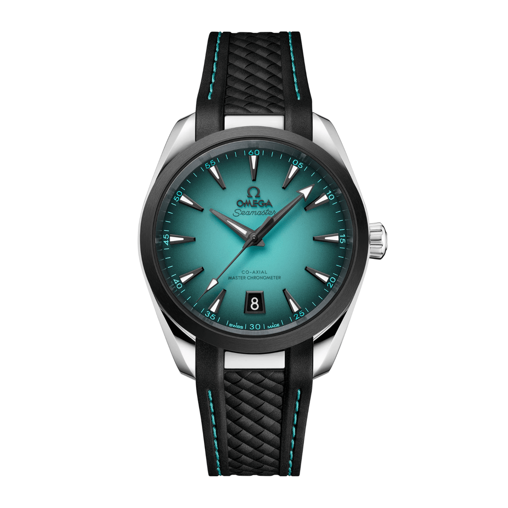 This 41 mm model has a symmetrical case in stainless steel and a bezel formed of brushed black ceramic. The lacquered turquoise dial offers a mesmerizing colour inspired by the ocean, and is accentuated with a black gradient effect, along with facetted hands and hour markers with a grey PVD treatment and white Super-Luminova. The OMEGA logo and date window are also grey PVD treated, matching the grey transferred wording, while the outer minute track is presented in turquoise. Comfort around the wrist is assured through the integrated black rubber strap, which includes turquoise stitching and a foldover clasp. On the inside, this watch is powered by OMEGA’s Co-Axial Master Chronometer Calibre 8900, certified at the industry’s highest standard by the Swiss Federal Institute of Metrology (METAS).