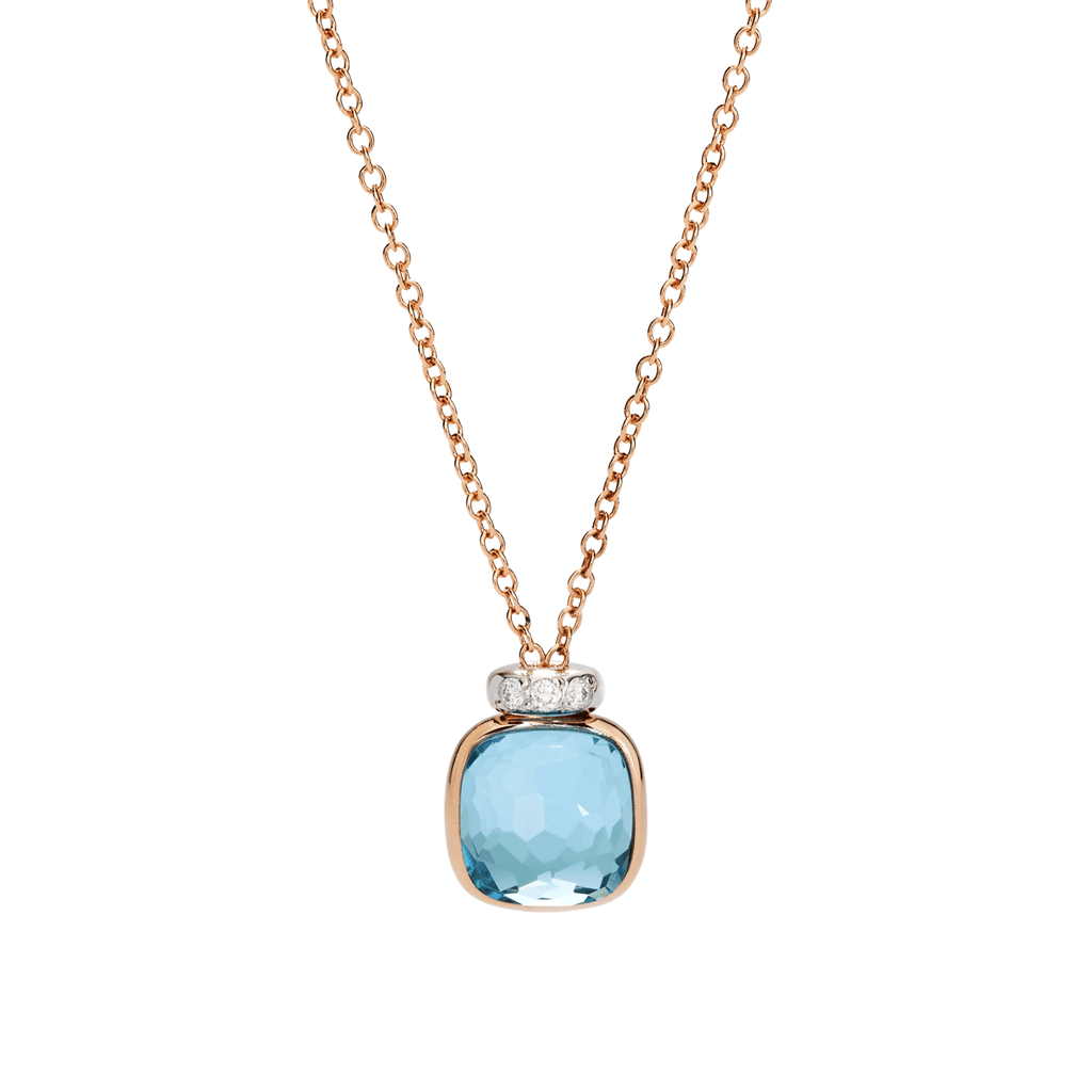Pomellato Nudo Mini Necklace with Pendant in 18k rose and white gold with 1 sky blue topaz (≈3.6 cts) and 3 white diamonds (≈0.02 ct) on 18k rhodium-plated white gold.