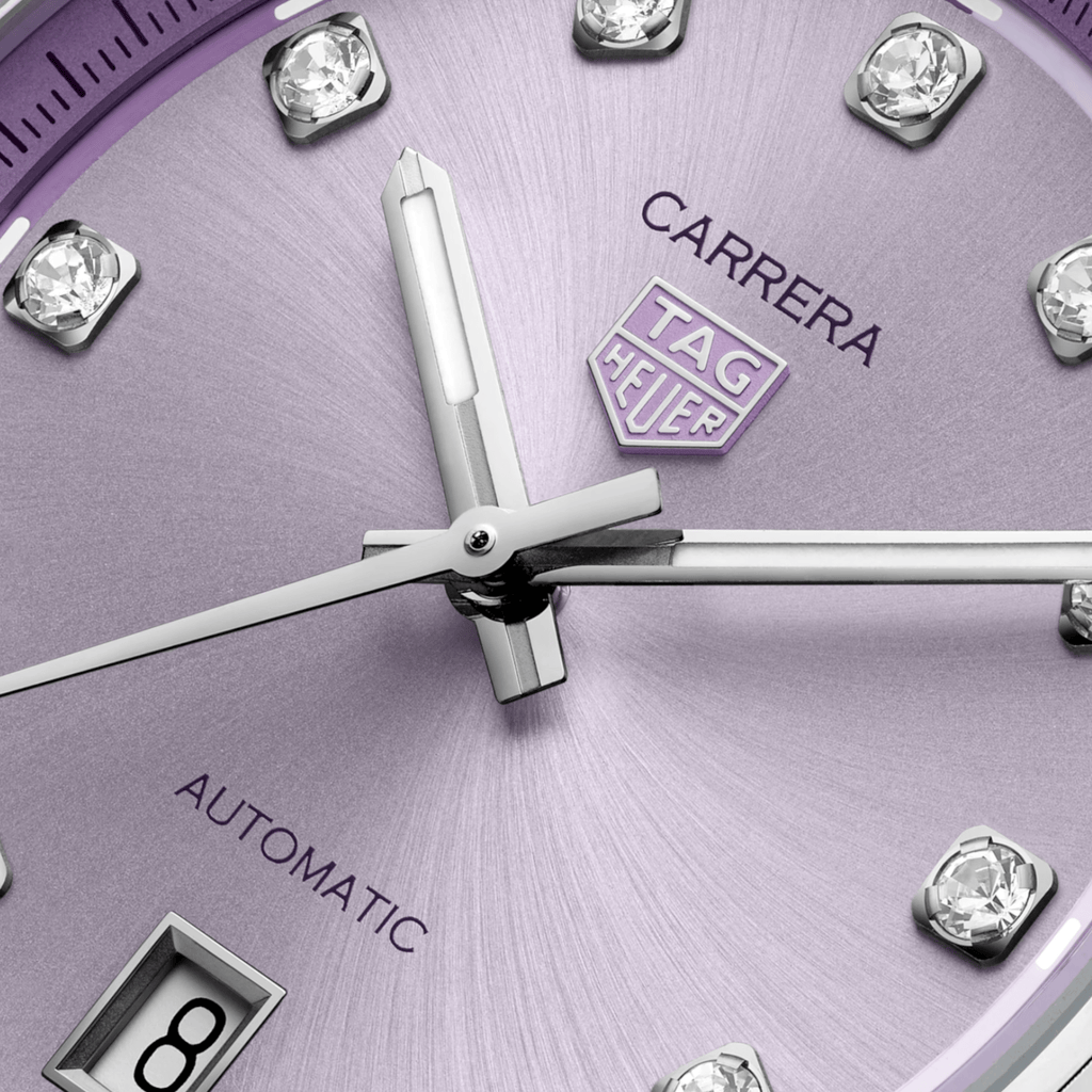 The TAG Heuer Carrera Date in 36mm brings a fresh touch to the collection with a captivating lilac dial. Featuring diamond-set indexes and powered by the Calibre 7 movement, this timepiece combines elegance with precision.