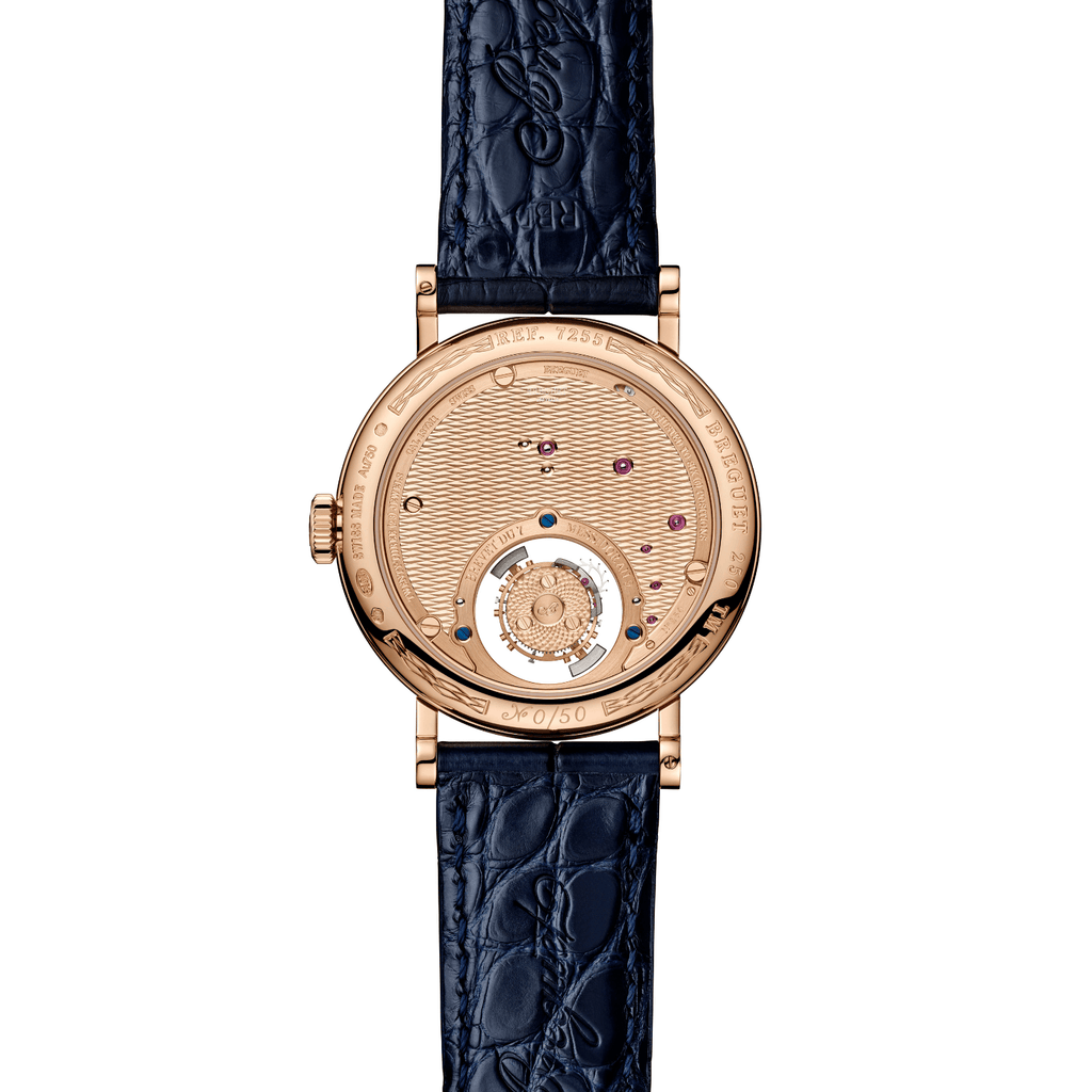 This exquisite timepiece features a 38mm case crafted from 18-karat Breguet gold, complemented by a blue Grand Feu enamel aventurine dial. It houses a manual-winding movement with a 50-hour power reserve and incorporates the Breguet Nivachron™ balance spring. The watch is equipped with a tourbillon and finished with an alligator leather strap.