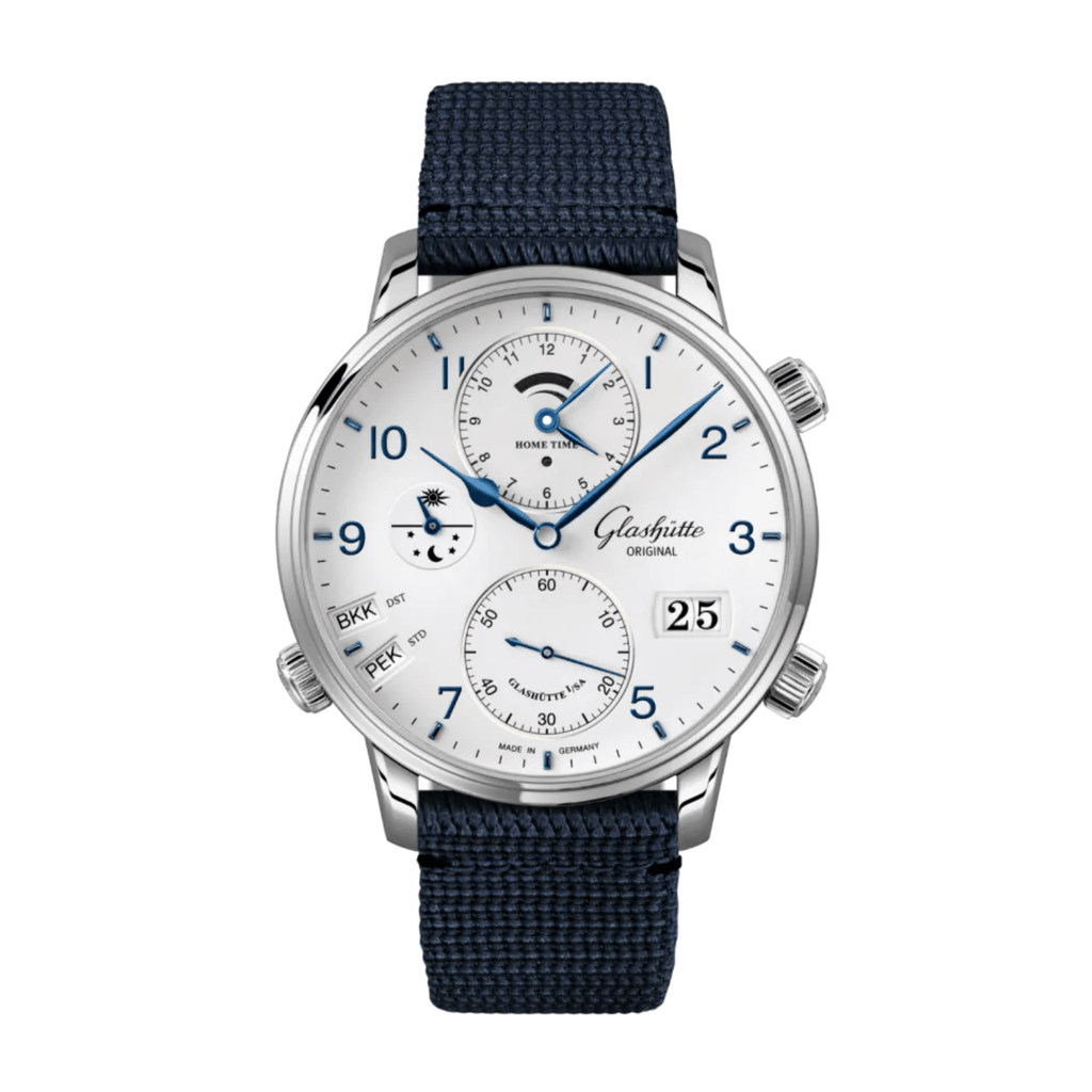 The Glashütte Original Senator Cosmopolite combines German watchmaking precision with practical global functionality. Its 44mm stainless steel case houses a sophisticated automatic movement with an impressive 72-hour power reserve, ensuring reliable timekeeping between windings. The white dial features a second time zone complication, panoramic date window, small seconds subdial, and power reserve indicator—ideal for the internationally minded collector. A day/night indicator adds utility for tracking time across hemispheres. Water-resistant to 5 bar, it handles daily wear confidently. The blue synthetic strap complements the refined aesthetic while offering durability and comfort. A versatile timepiece that merges horological sophistication with worldly practicality.