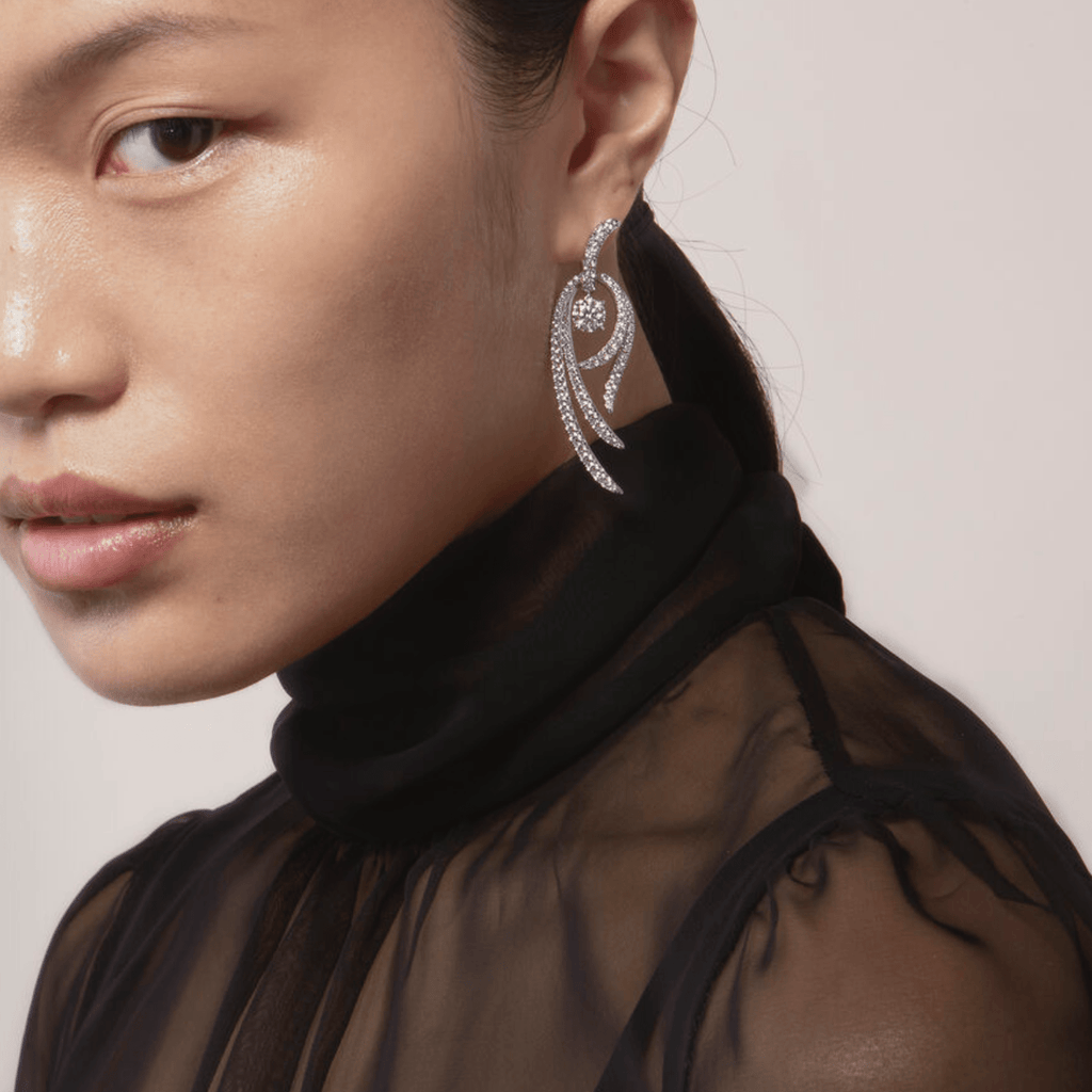Made with 18 karat white gold vela twisted drop earrings. Diamonds, totaling 6.1 carats.