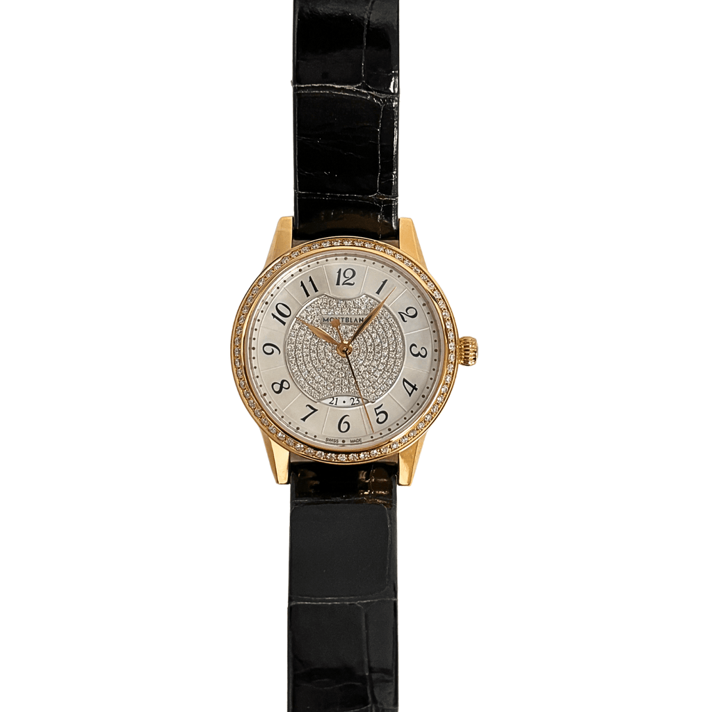 30mm rose gold case with diamond bezel, diamond-set white dial. Date display. Automatic movement. Alligator leather strap.
