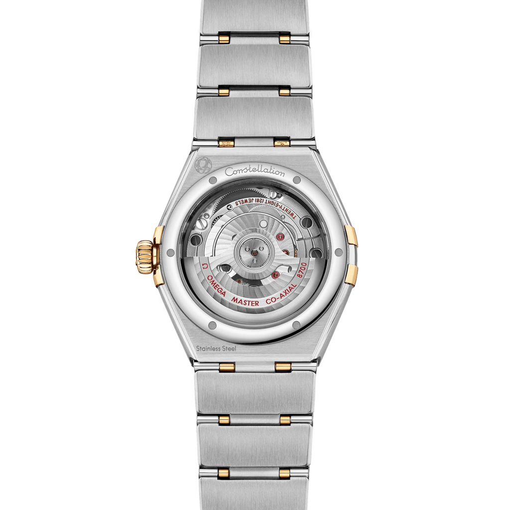 The OMEGA Constellation 29mm timepiece showcases an 18K yellow gold and stainless steel build, complete with a diamond-encrusted bezel, sun-brushed champagne dial, and diamond hour markers. A date window graces the 6 o'clock position, while the hands, OMEGA logo, Constellation star, and diamond holders are all crafted in 18K yellow gold. The heart of this watch is powered by the OMEGA Co-Axial Master Chronometer Calibre 8700, visible through a scratch-resistant sapphire crystal dome.