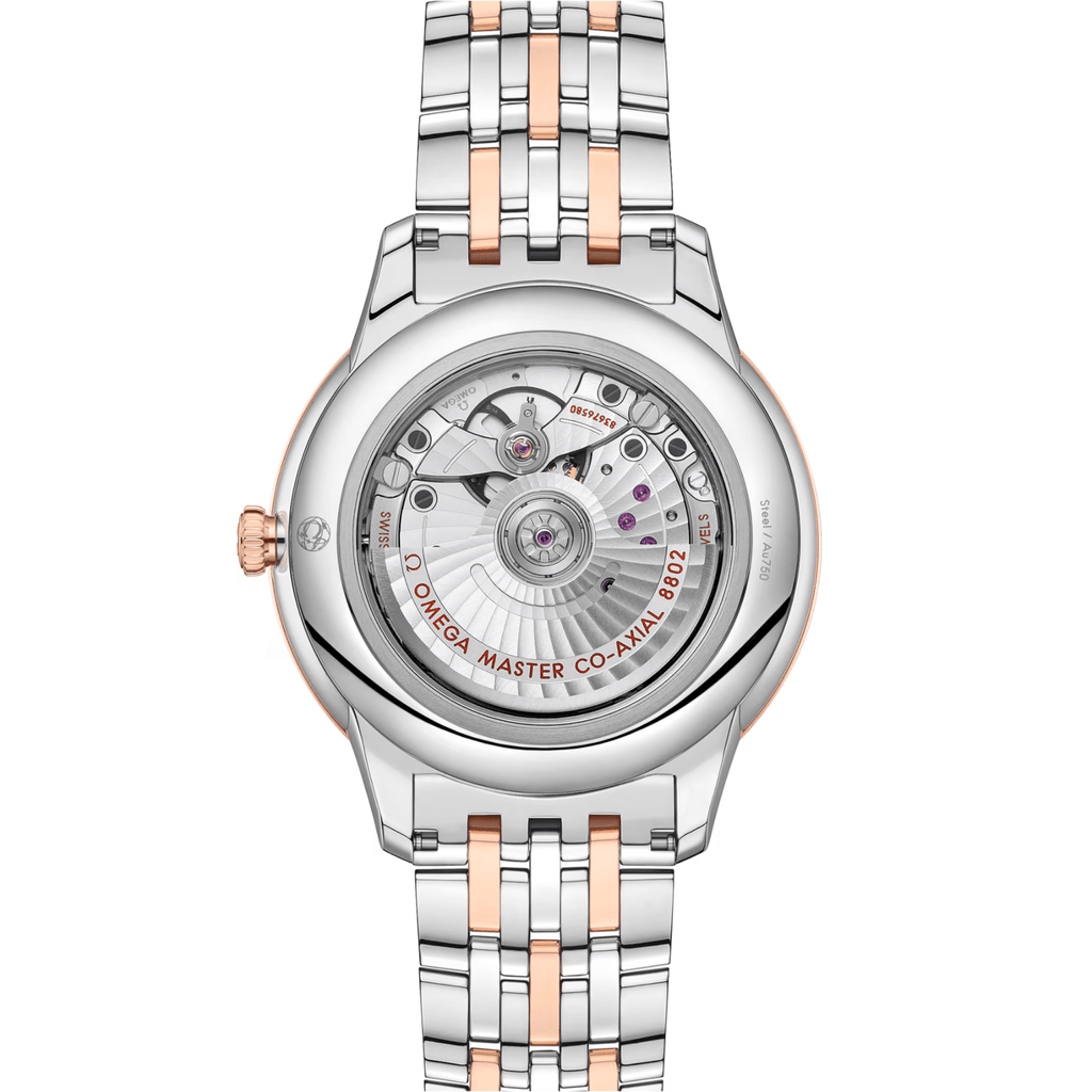 This Master Chronometer certified watch is presented on a stainless steel - Sedna™ Gold bracelet and is driven by the OMEGA Master Co-Axial Calibre 8802, which can be admired through the scratch-resistant sapphire crystal caseback.