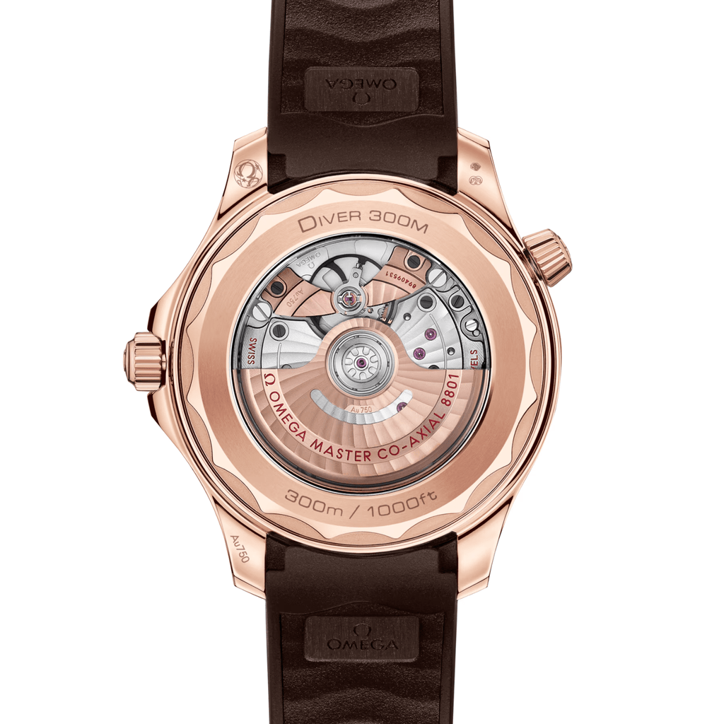 The watch is presented on a brown rubber strap and is driven by the OMEGA Master Chronometer Calibre 8801, which can be seen through the sapphire-crystal on the wave-edged caseback.