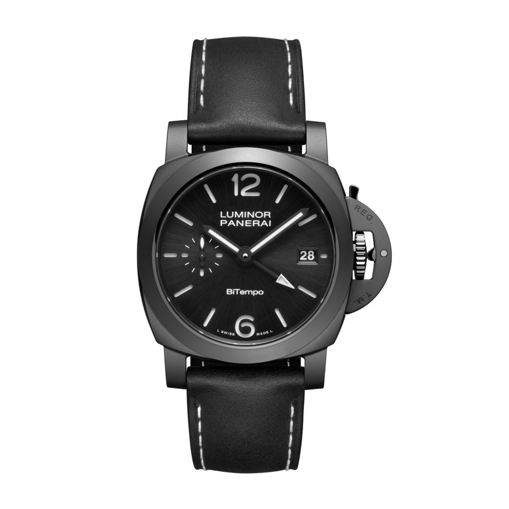 Panerai Luminor GMT Ceramica in a 40mm black ceramic case with black dial on leather strap, featuring a gmt hand, date aperture, small seconds display, and automatic movement with up to 3 days of power reserve.