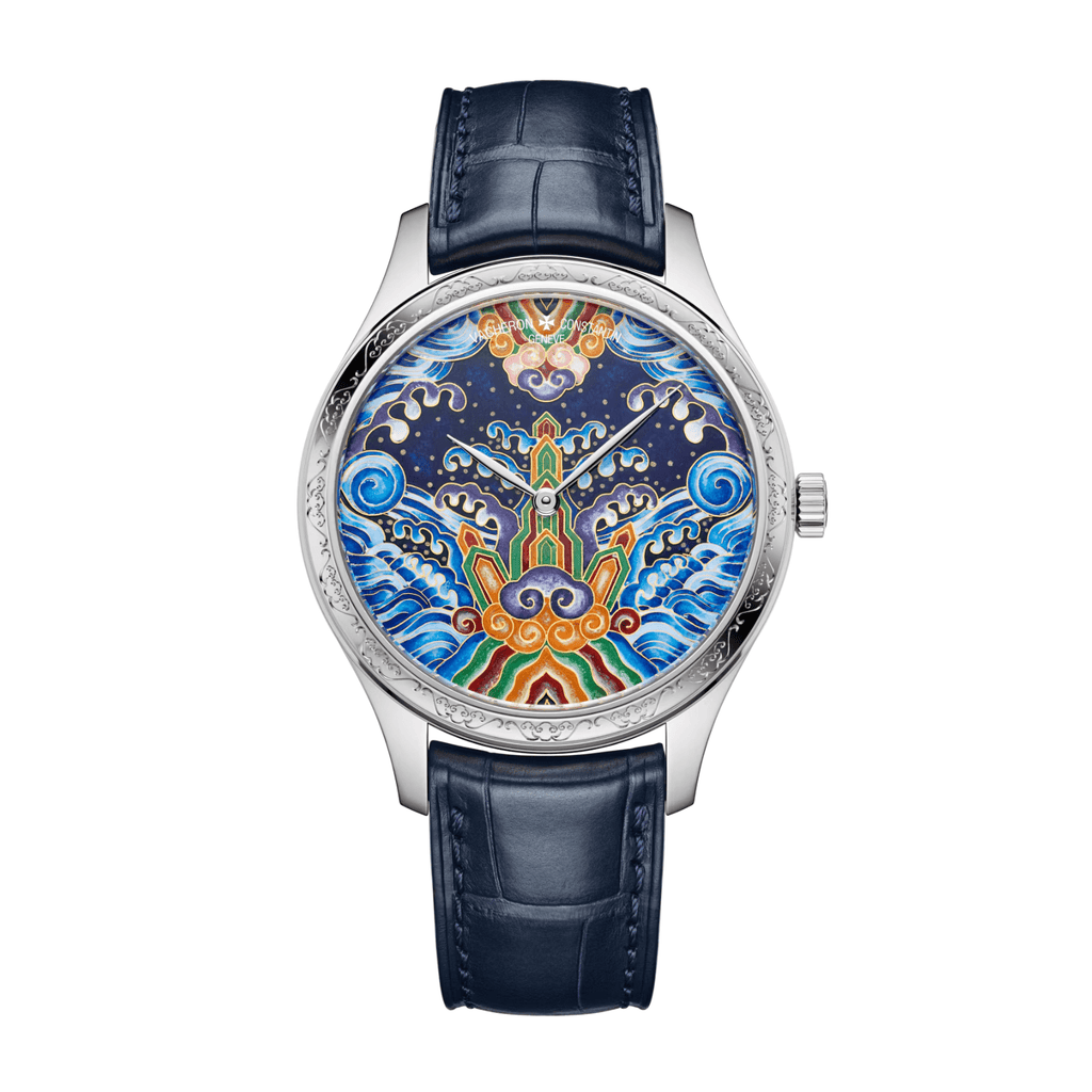 Paying tribute to Chinese cultural tradition, this limited edition in 18K white gold highlights a highly symbolic motif : the "Seawater Cliff", combining the fluidity of water against the force of the mountain. Illustrated on the dial and rotor, it is sign of long-lasting unification and stability of the country as well as prosperity and longevity. Named Eternal flow, this cultural heritage is brought to life thanks to the mastery of cloisonné enamel. The hand-engraved bats on the bezel amplify the symbolism of the motif. Its self-winding movement is stamped with the Hallmark of Geneva, a guarantee of excellence and reliability.