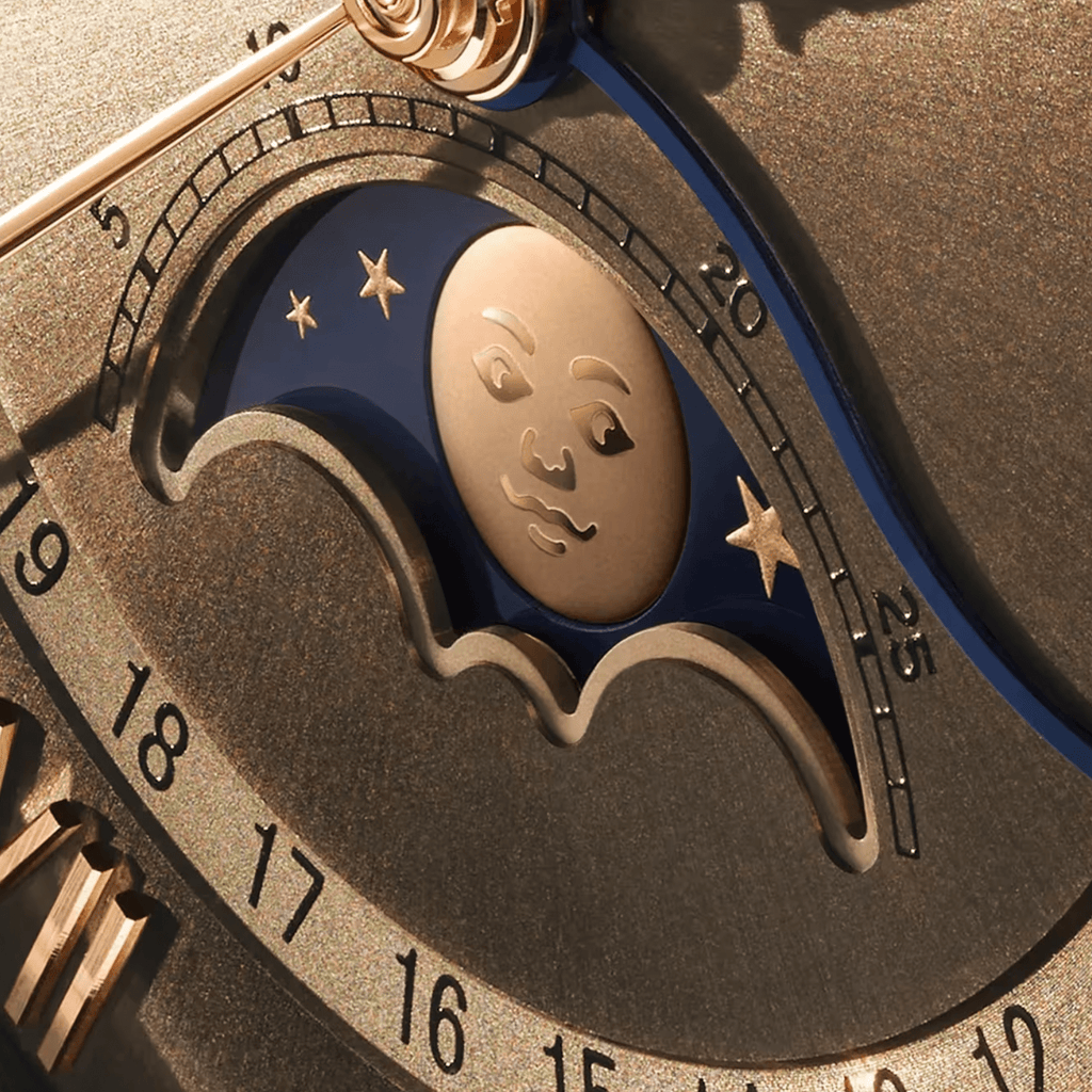 This timepiece features a 40mm red gold case paired with a brown dial. It is powered by an automatic movement with a 72-hour power reserve. Functions include moon phase and date display, complemented by an alligator leather strap.