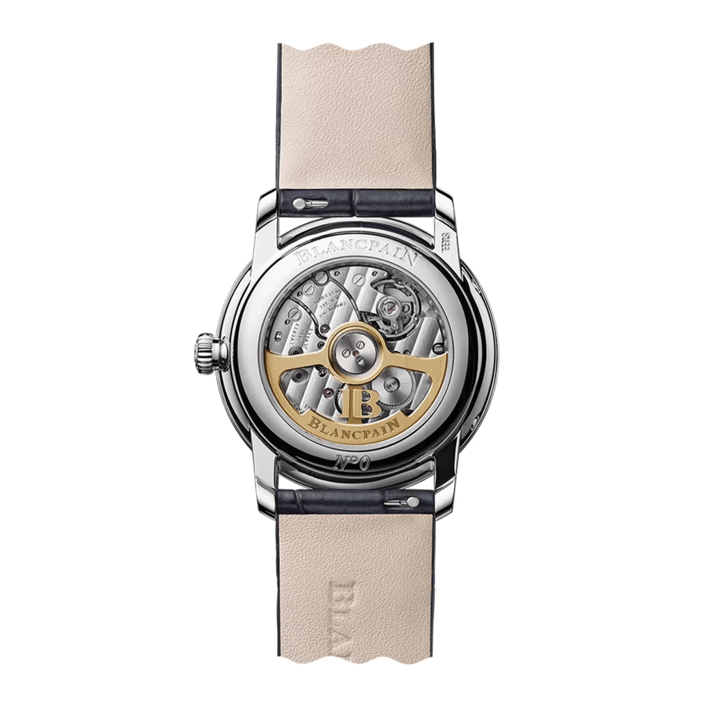 This timepiece features a 33mm stainless steel case with diamond-set bezel paired with a opaline dial with diamond markers. It is powered by an automatic movement with a 40-hour power reserve. Functions include moon phase and date display, complemented by an alligator leather strap.