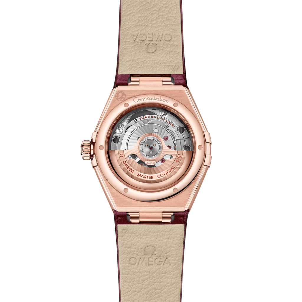 This 29 mm 18K Sedna™ gold model showcases a bezel adorned with diamonds, a mother-of-pearl dial with diamond hour markers, and a small date window at 6 o'clock. The hands, OMEGA logo, Constellation star, and diamond holders are all crafted from 18K Sedna™ gold. Replacing the iconic mono-rang bracelet is a burgundy strap made from shimmering leather. At its core lies the OMEGA Co-Axial Master Chronometer Calibre 8701, visible through the scratch-resistant sapphire crystal.