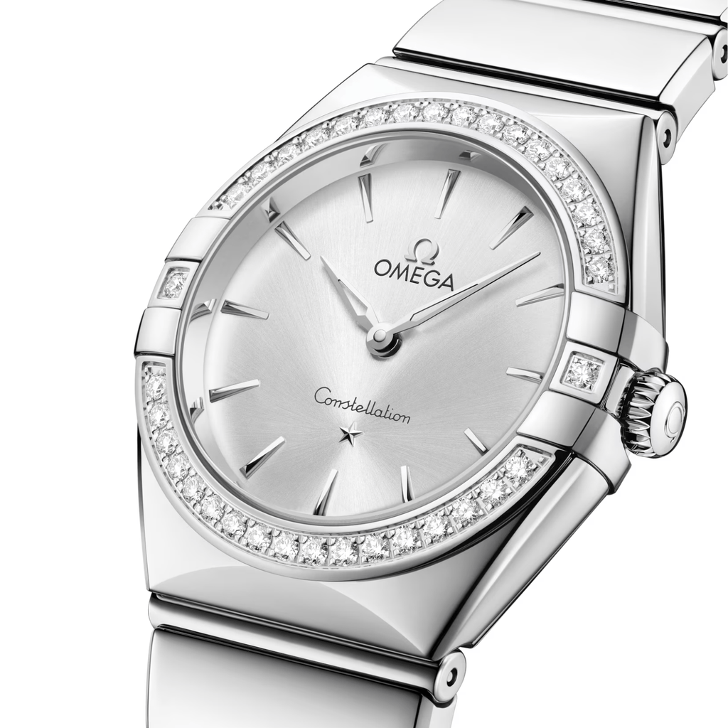 This 28 mm model is crafted in stainless steel and features a radiant diamond-paved bezel. The sun-brushed silvery dial has been given a galvanic treatment, while other details include polished and skeletonized 18K white Gold hands and star at six o’clock, and hour markers in polished 18K white Gold.