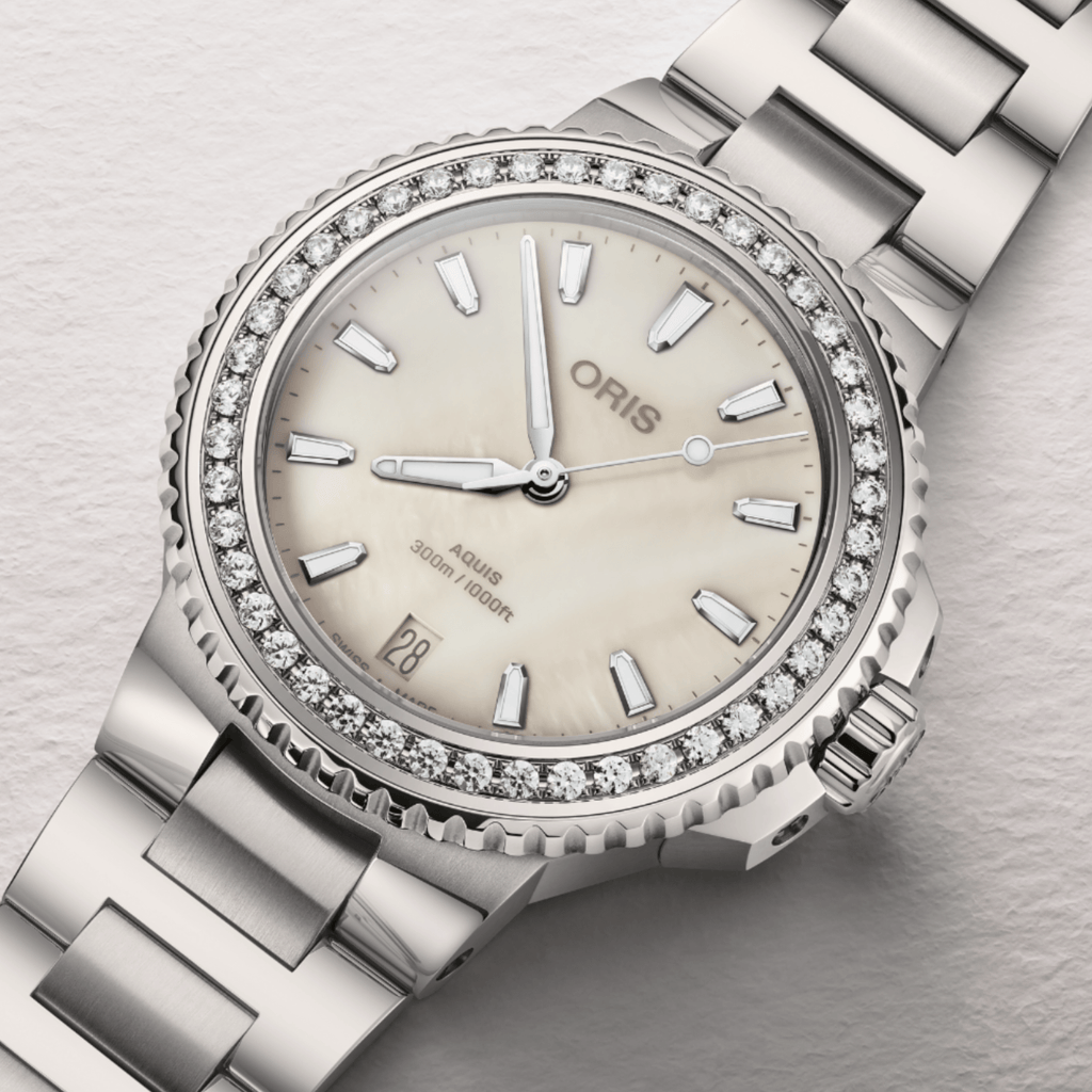36mm stainless steel case, beige mother of pearl dial, diamond indices and diamond bezel. Water resistance of 30 bar. Automatic movement, power reserve of 41 hours. Date display. Stainless steel bracelet.