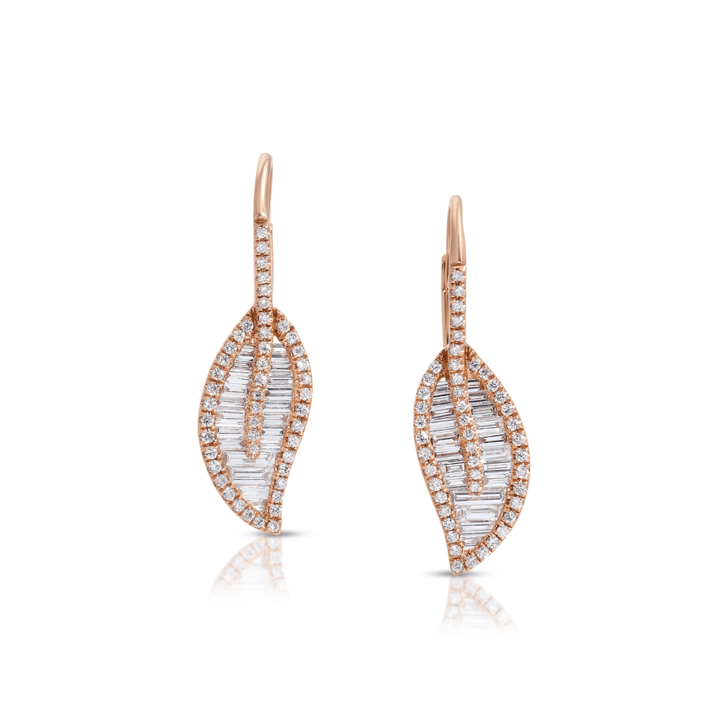 Anita Ko Leaf Drop Earrings with Pave Diamond Stem in 18K Rose Gold. Diamonds totaling 0.44 carats. Baguette diamonds totaling 1.28 carats.