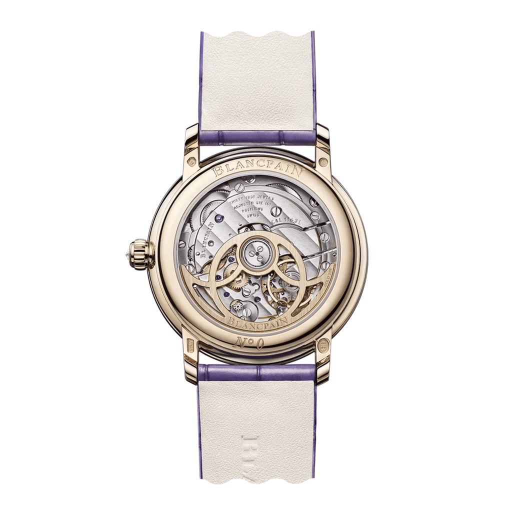 Blancpain Ladybird Colors Phases de Lune in 34.9mm red gold case with white mother-of-pearl set with diamonds on violet alligator leather strap, featuring moon phase and an automatic movement with a power reserve of 100 hours and water resistance of 3 bar.