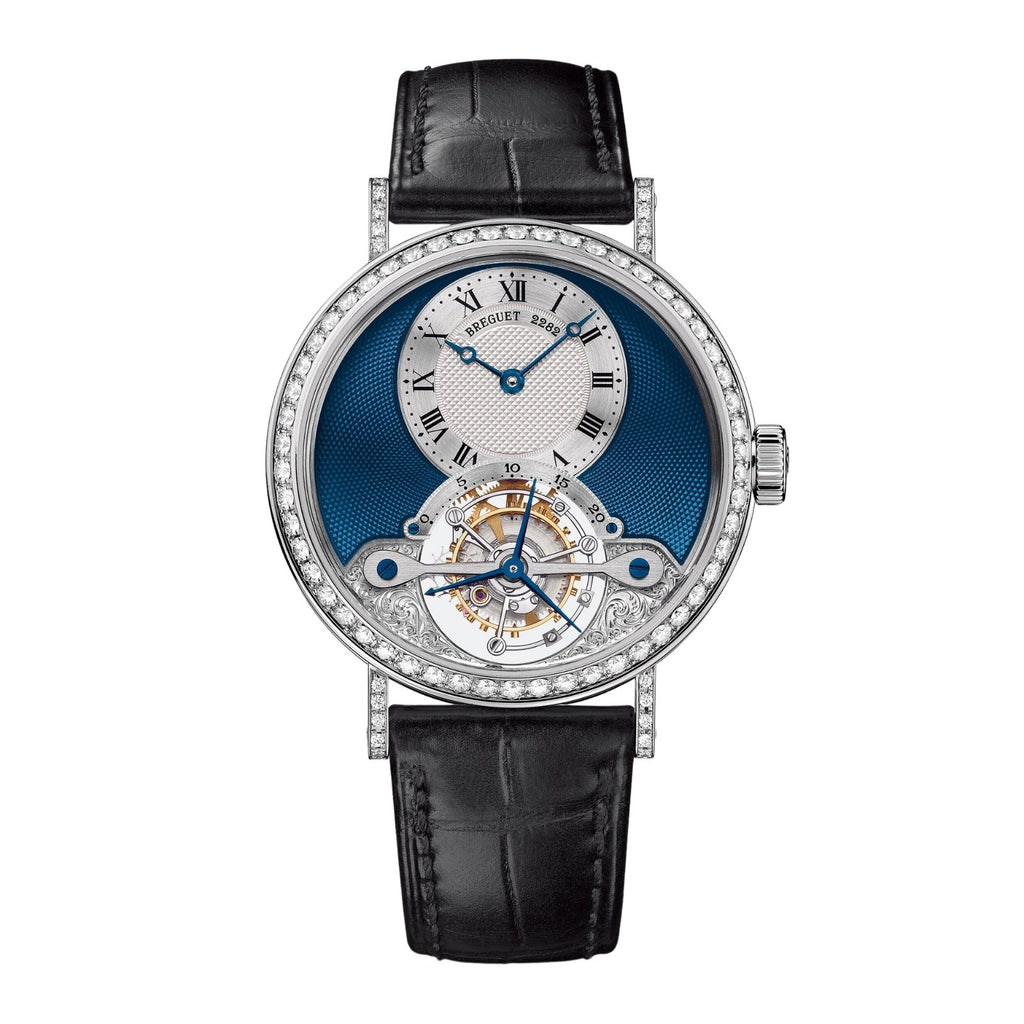 Classique “Grande Complication” wristwatch in 18-carat white gold, with tourbillon. Hand-wound movement. Running seconds on the tourbillon shaft. Compensating balance spring with Breguet overcoil. Bezel and lugs set with 74 diamonds, approx. 1.33 cts . Natural mother-of-pearl dial, hand-engraved on a rose engine. Breguet Arabic numerals. Sapphire caseback. Water-resistant to 3 bar ( 30 m ). Diameter : 35 mm. Also with gold dial hand-engraved on a rose engine with translucent blue or red enamel coating.