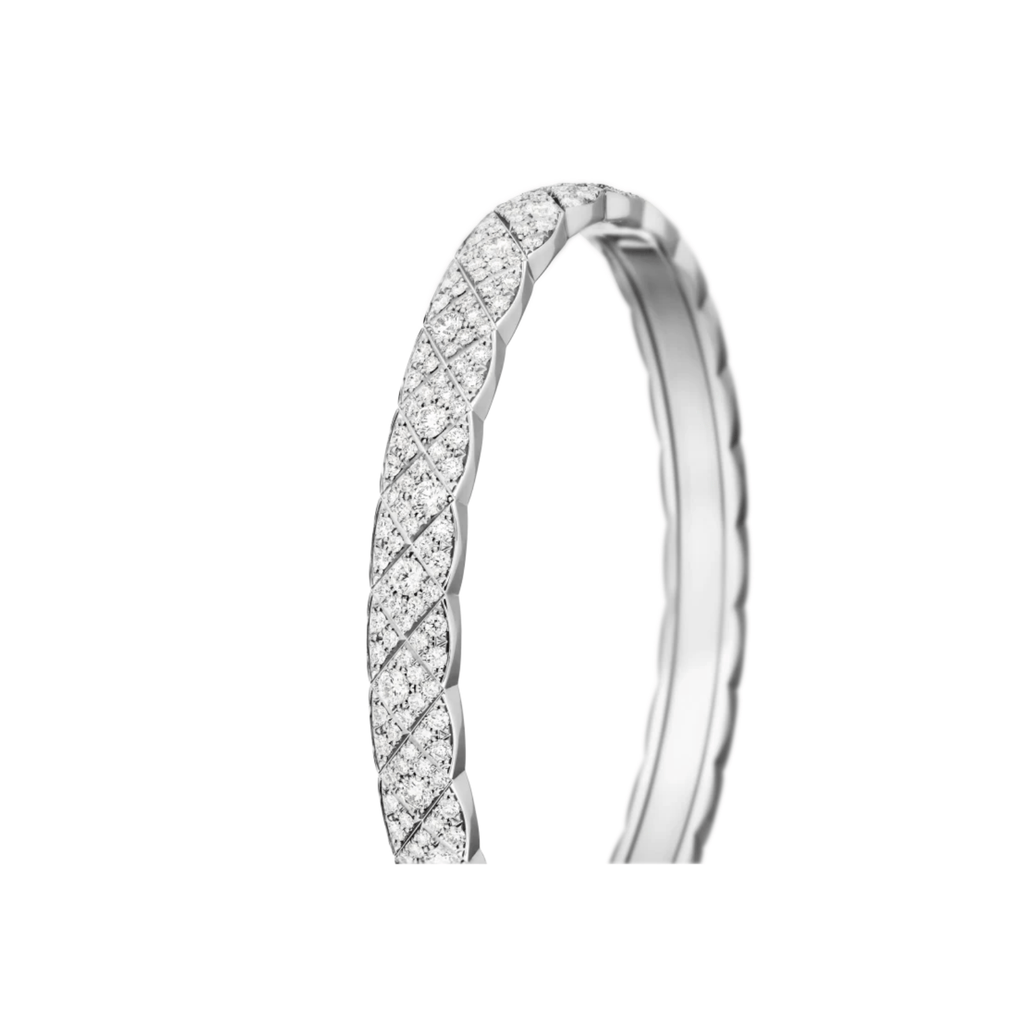 This CHANEL Coco Crush Bracelet features a distinctive quilted design crafted in 18K white gold, adorned with 308 brilliant-cut diamonds that collectively weigh 4.66 carats.