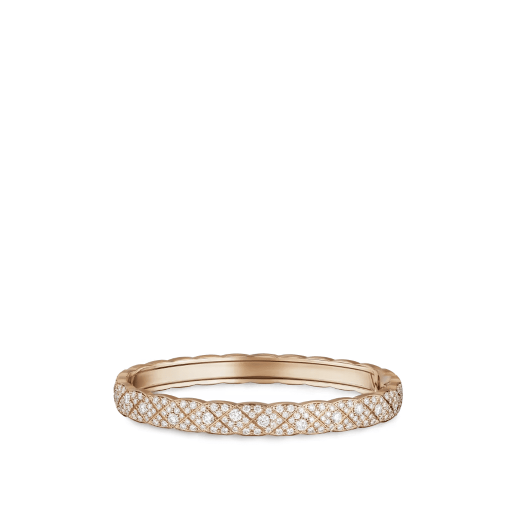 This CHANEL Coco Crush Bracelet features a distinctive quilted design crafted in 18K beige gold, adorned with 308 brilliant-cut diamonds that collectively weigh 4.66 carats.