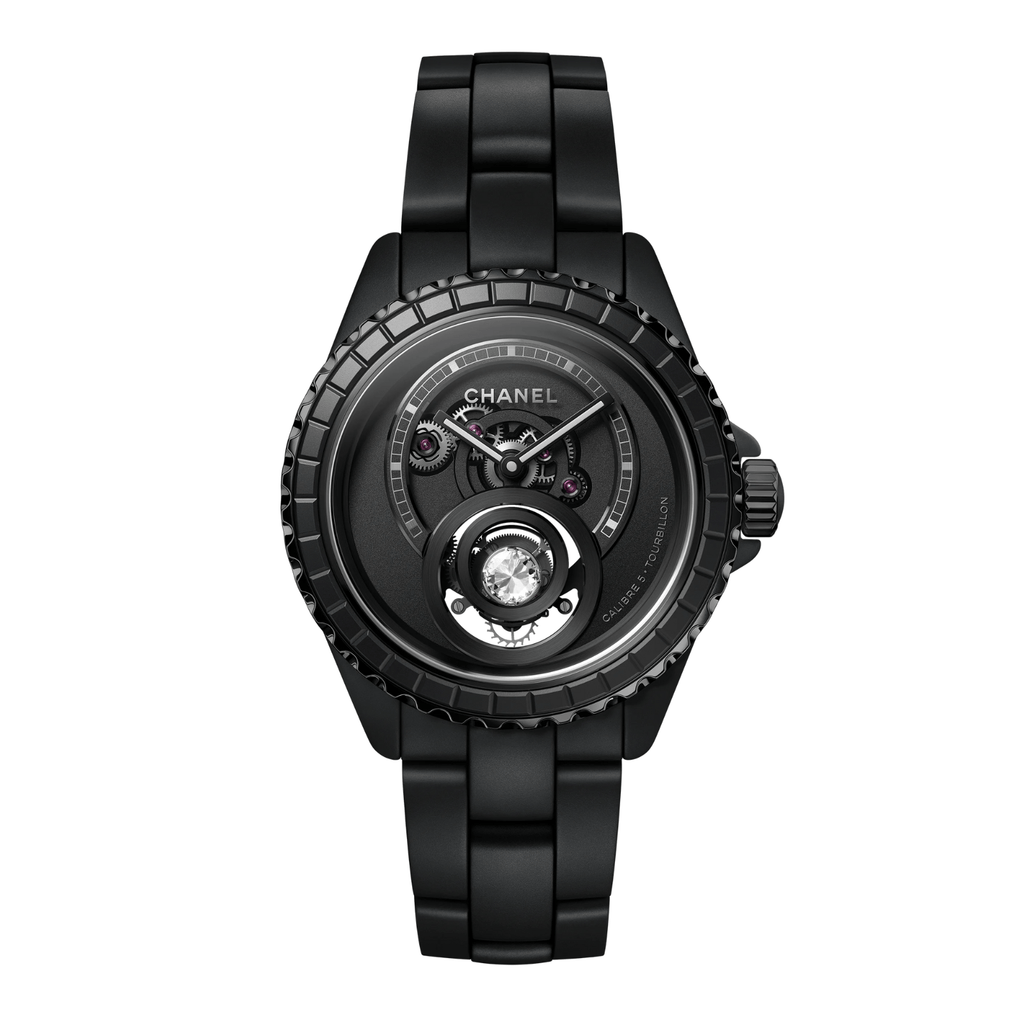 The CHANEL J12 Diamond Tourbillon Watch Caliber 5 features a 38 mm case crafted from matte black highly resistant ceramic and steel with a black coating. Its fixed steel bezel is enhanced with a black coating and a matte black ceramic ring displaying a baguette pattern. The crown, made of steel with black coating, is set with a matte black ceramic cabochon. The matte black openwork dial complements the matte black ceramic bracelet secured by a steel triple-folding buckle. Powered by the manual-winding Caliber 5 movement, it offers approximately 42 hours of power reserve, displaying hours and minutes with 50 meters of water resistance.