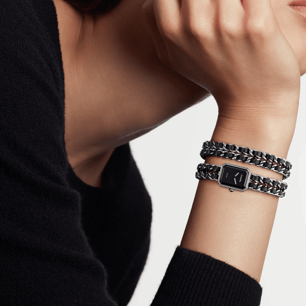 Measuring 19.7 x 15.2 x 7.5 mm, this watch features a steel case and a steel crown adorned with an onyx cabochon. Its dial is finished in black lacquer, complemented by a double-row steel chain bracelet interlaced with black leather. Powered by a high-precision quartz movement, it displays hours and minutes with 30-meter water resistance.
