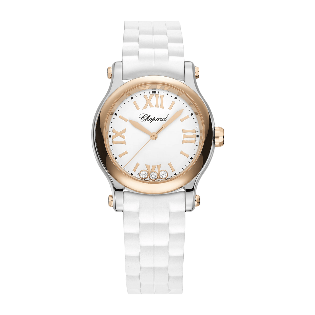 26mm ethical rose gold case, quartz movement. Dancing diamonds. Since 1976 and the invention of the first Happy Diamonds watch, dancing diamonds have been merrily lighting up the collection. Most of all, Happy Diamonds watches assert a playful, airy spirit...