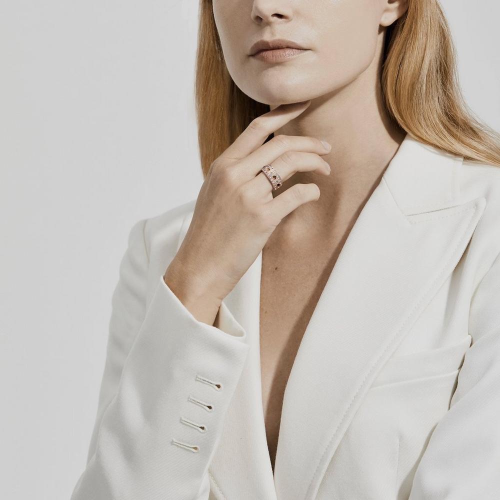 The combination of rough and polished white and fancy colour diamonds in this ring embodies the beauty of the original talisman. Considered a symbol of power long before they became a symbol of love, rough diamonds in themselves were worn as talismans, and so are the focus of our Talisman collection. The 18K rose gold, at a width of 8.0 mm, provides the ideal canvas on which to showcase ~70 individual diamonds, totalling ~1.82 carats. Arranged next to round brilliant and rose-cut polished diamonds, rough diamonds are brought to life in this bold design.