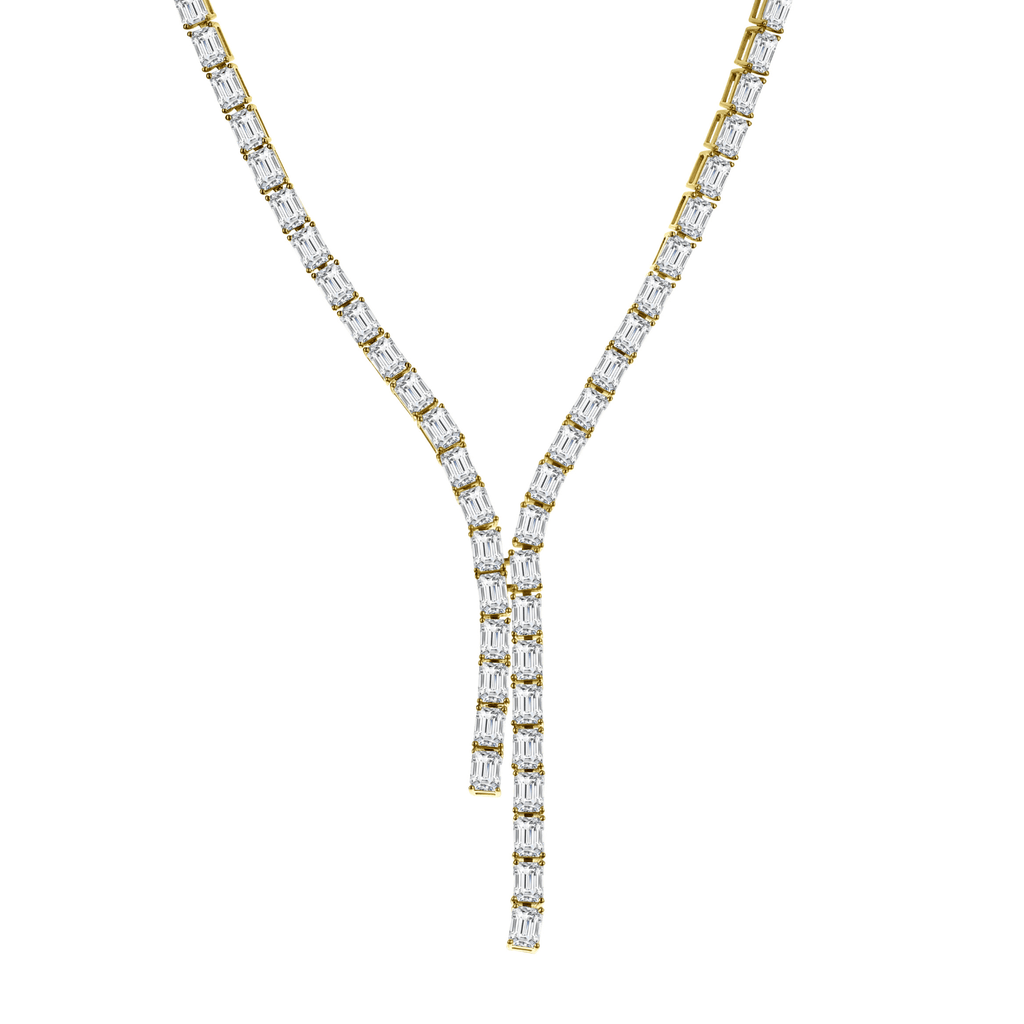 This lariat necklace is crafted in 18 karat yellow gold with emerald cut diamonds totaling 24.50 carats.