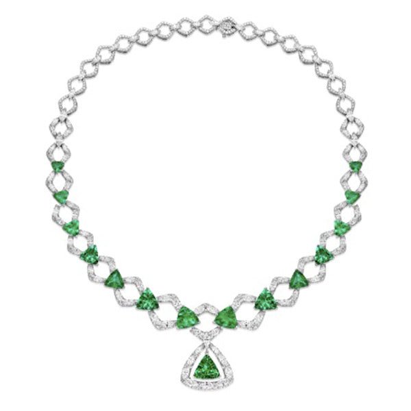 Emerald Diamond Necklace in 18 karat white gold with emeralds totaling 21.82 carats and diamonds totaling 19.92 carats.