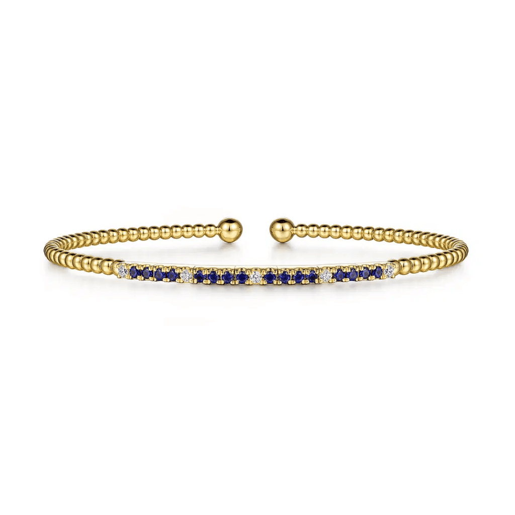 Gabriel & Co. Bujukan Diamond and Blue Sapphire Split Bangle in 14 karat yellow gold. Diamonds totaling 0.09 carats.