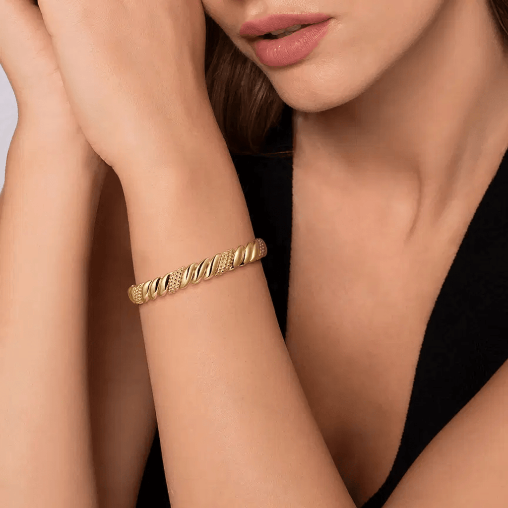 The Gabriel & Co. Bujukan Open Bangle, crafted from 14K yellow gold, exemplifies expert craftsmanship and timeless design. Has a lock mechanism.