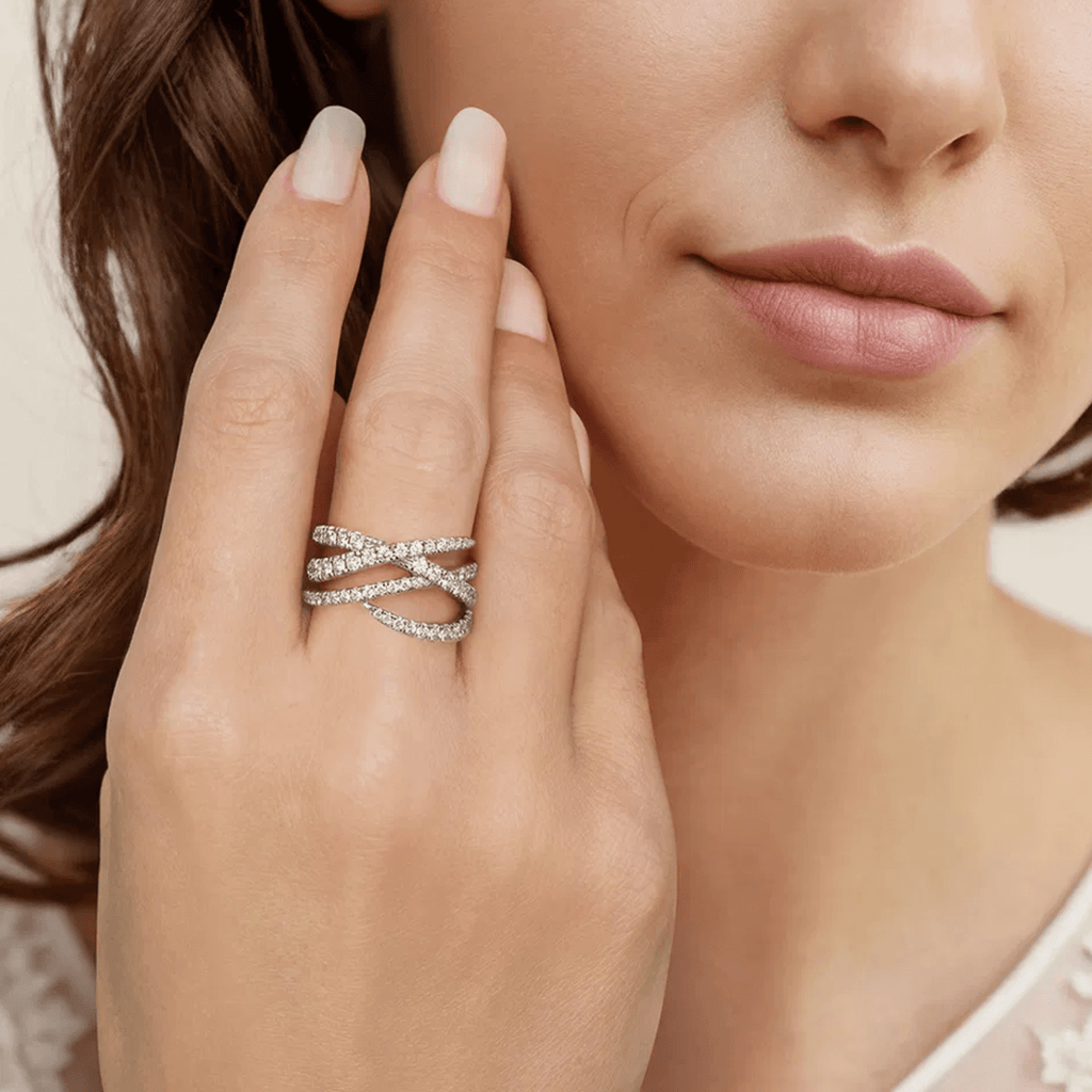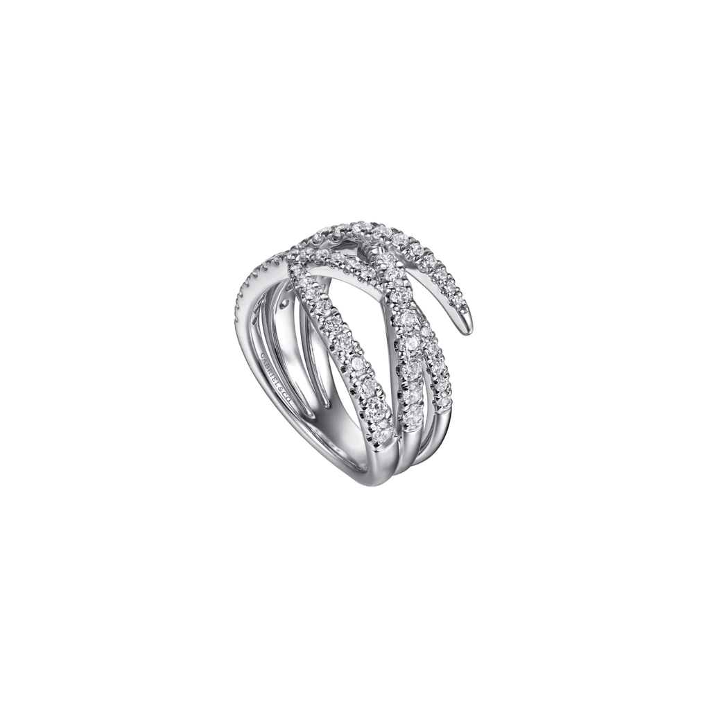 This crisscross ring from Gabriel & Co. features 14K white gold and diamonds with a combined weight of 0.79 carats.
