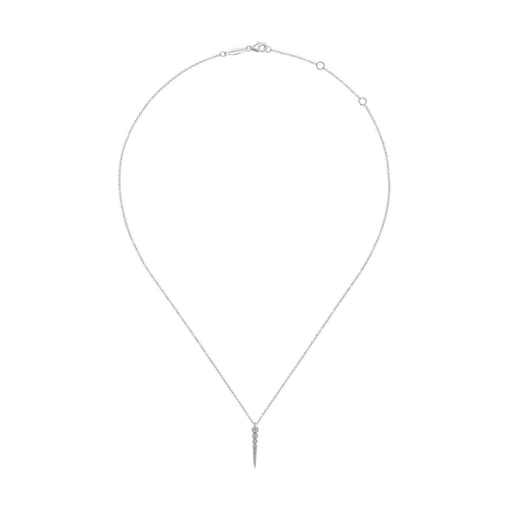Inspired by clean geometric shapes, this Kaslique collection necklace epitomizes the sleek modern look. A tapered spike pendant is the sole adornment on an adjustable 14K white gold chain. The pendant features a graduated column of 0.24ct round diamonds for sophisticated sparkle.