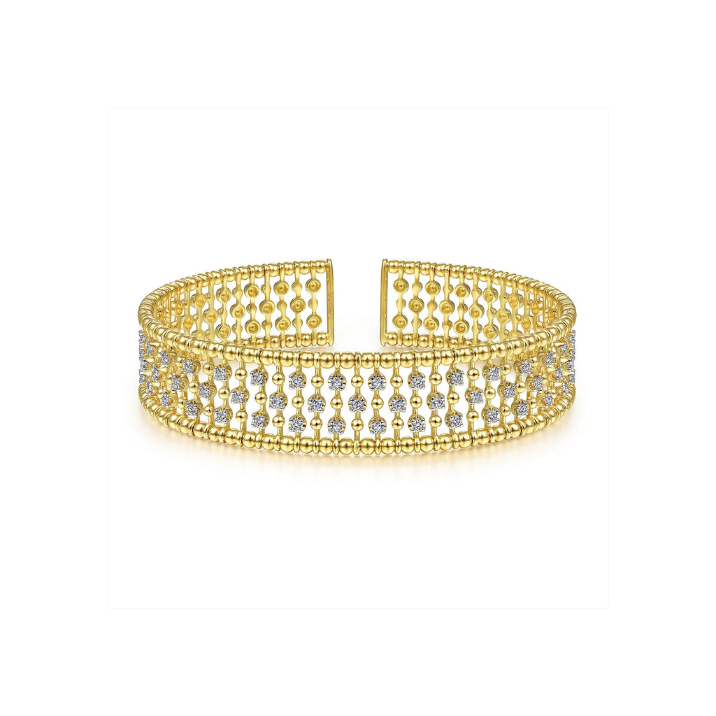 Gabriel & Co. Wide Diamond Cage Cuff Bracelet in 14K yellow gold with diamonds totaling 0.75 carats.