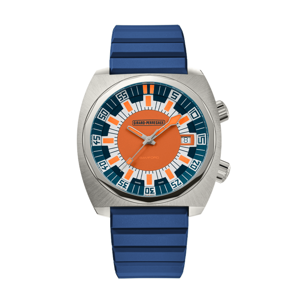 A limited edition of 350 timepieces, the Girard-Perregaux Deep Diver boasts a 40.3mm x 38mm rectangular titanium case with an orange, white, and blue dial, paired with both blue and orange rubber straps, and features an automatic movement with a minimum power reserve of 46 hours.