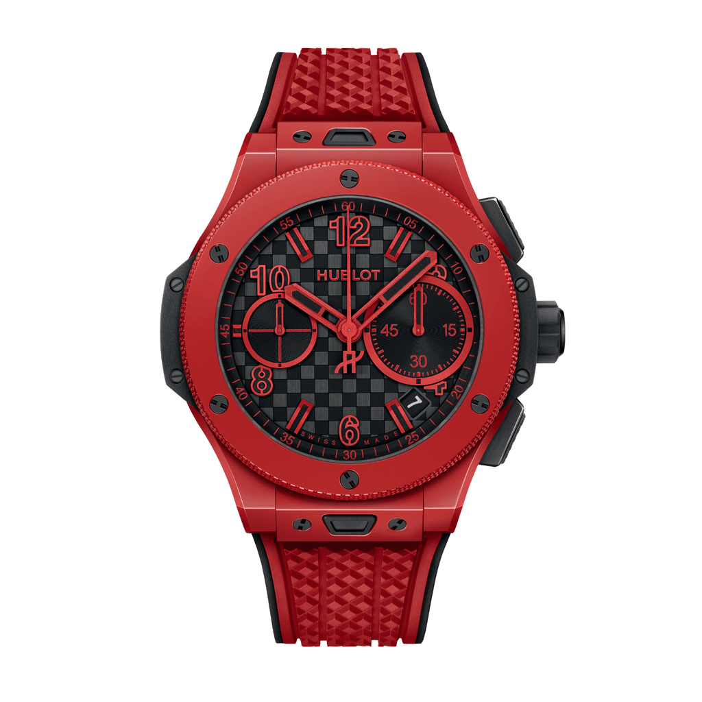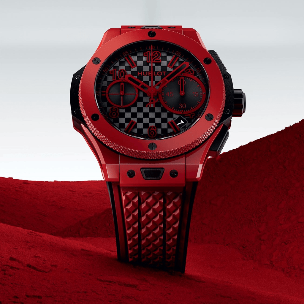 This watch features a 43mm microblasted and polished red ceramic case and bezel with a structured pattern on the side. It has a water resistance of 100m or 10 ATM and a sapphire crystal with anti-reflective treatment. The dial is stamped with a satin-finished "Carbon Effect" and it runs on a HUB1280 UNICO manufacture self-winding chronograph flyback movement with column wheel. It has a power reserve of approximately 72 hours and comes with red and black structured rubber straps and a black ceramic and black-plated titanium deployant buckle clasp.