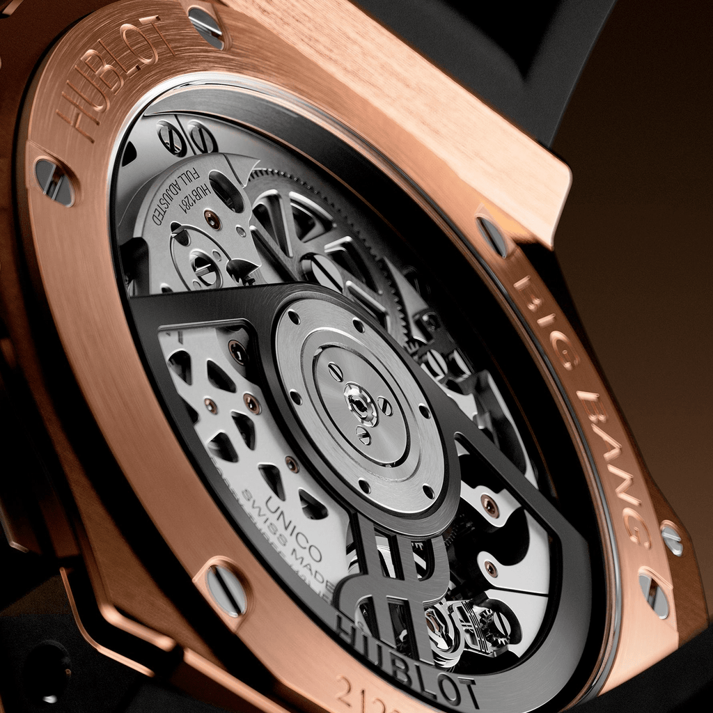 43 mm polished and satin-finished 18K King Gold case with a black ceramic structured bezel, sapphire crystal with anti-reflective treatment, carbon-effect dial, 100 m water resistance, and HUB1280 UNICO manufacture self-winding flyback chronograph movement with an approximate 72-hour power reserve, finished with black structured rubber straps and an 18K King Gold and black-plated titanium deployant buckle clasp.