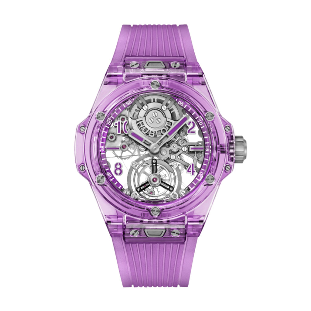 44mm Purple Sapphire Crystal case, Sapphire Crystal dial. Water resistance to 30m. Automatic Tourbillon Movement, power reserve to up to 72 hours. Transparent purple structured lined rubber straps with titanium deployant buckle clasp.